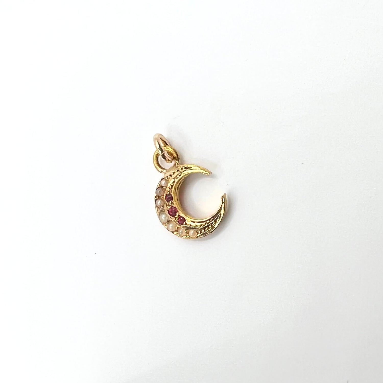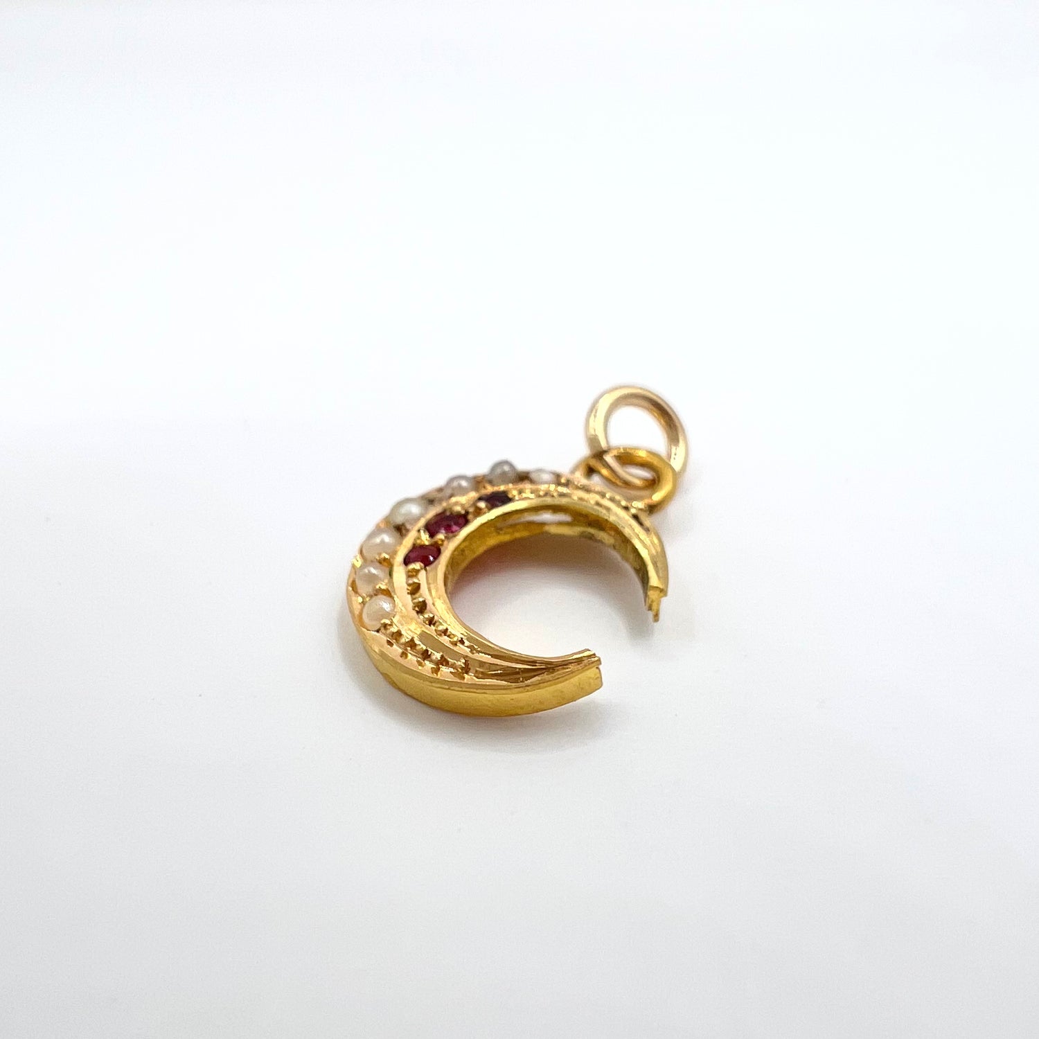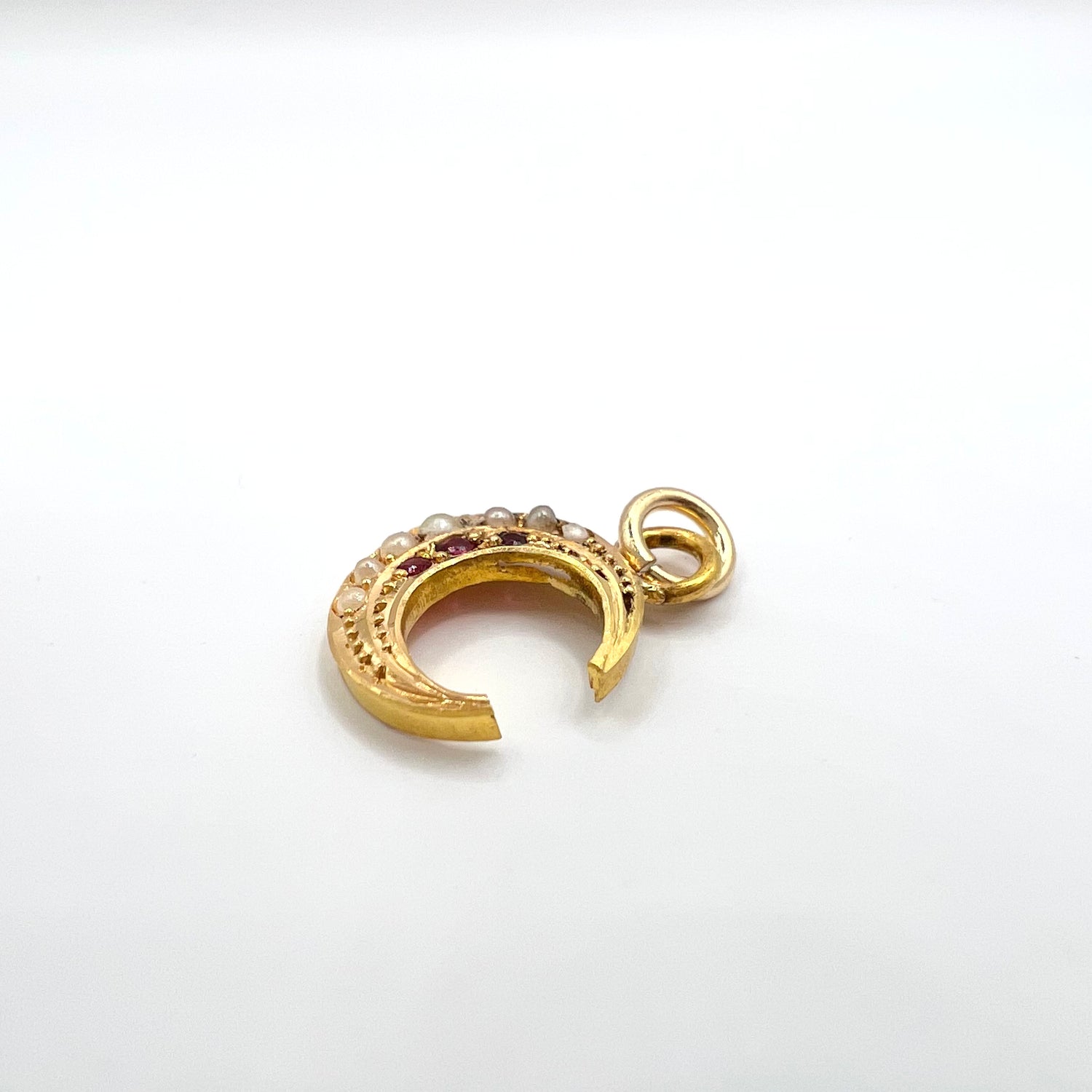 A beautiful small Antique Victorian 15 ct gold crescent moon charm pendant in fine vintage condition, featuring three small rubies and seven seed pearls with delicate gold detailing.