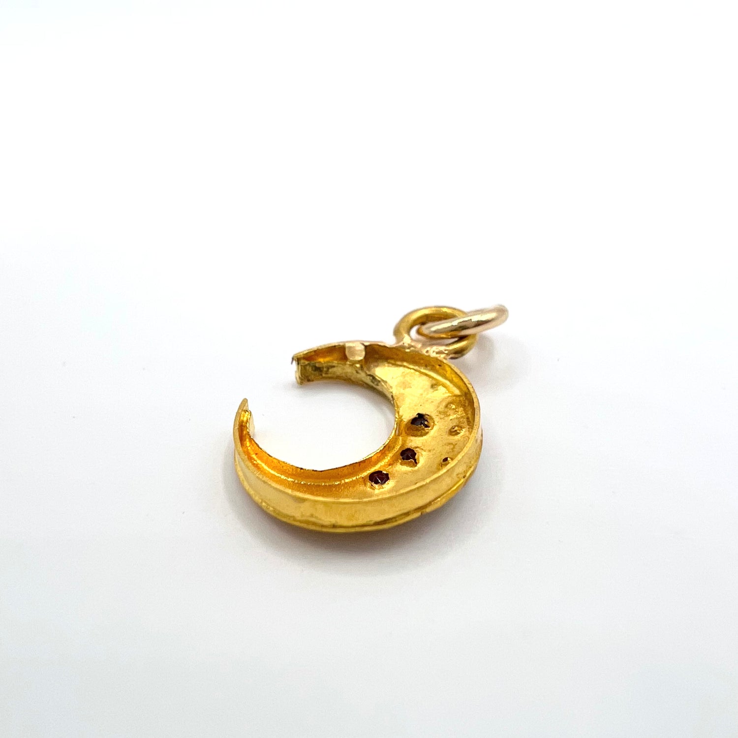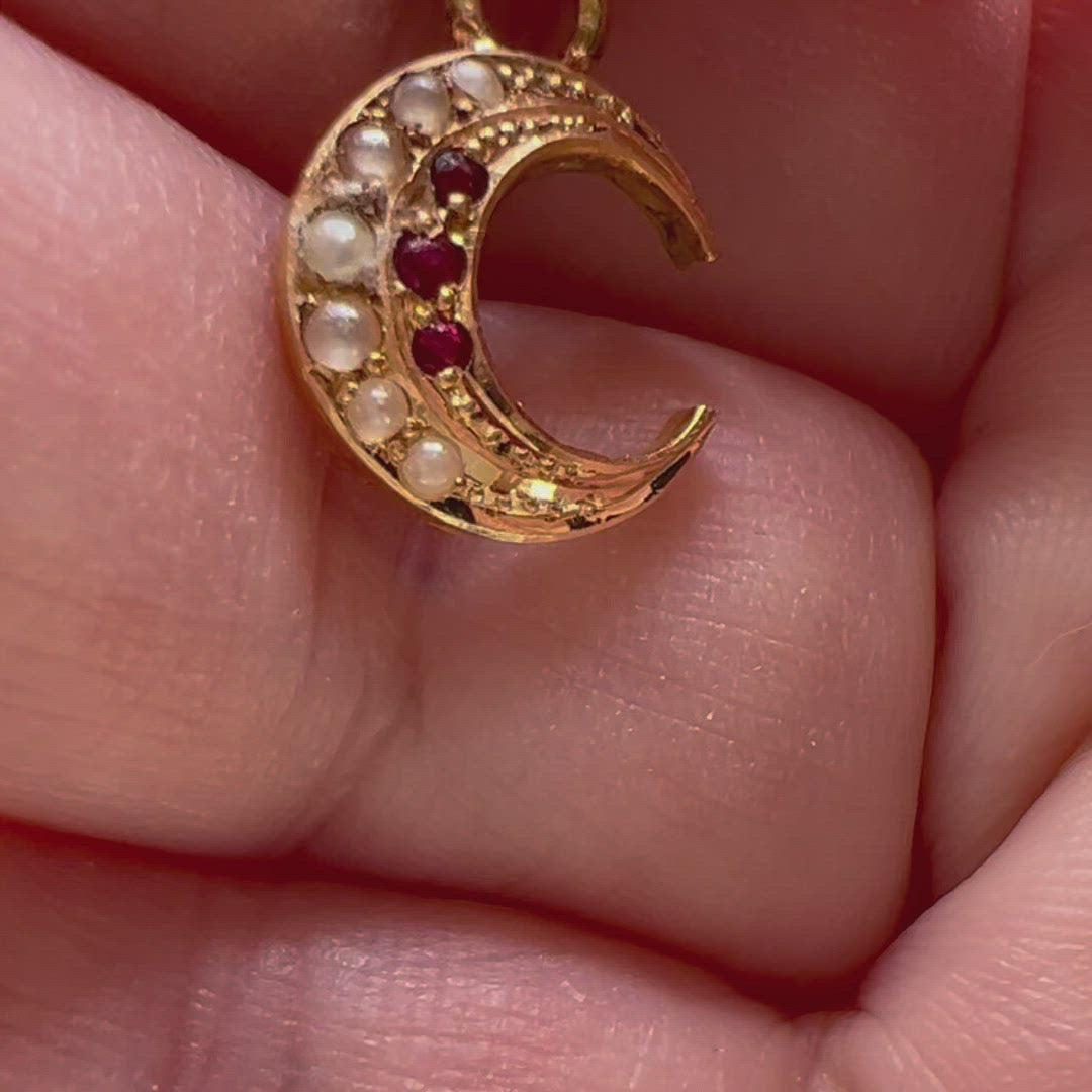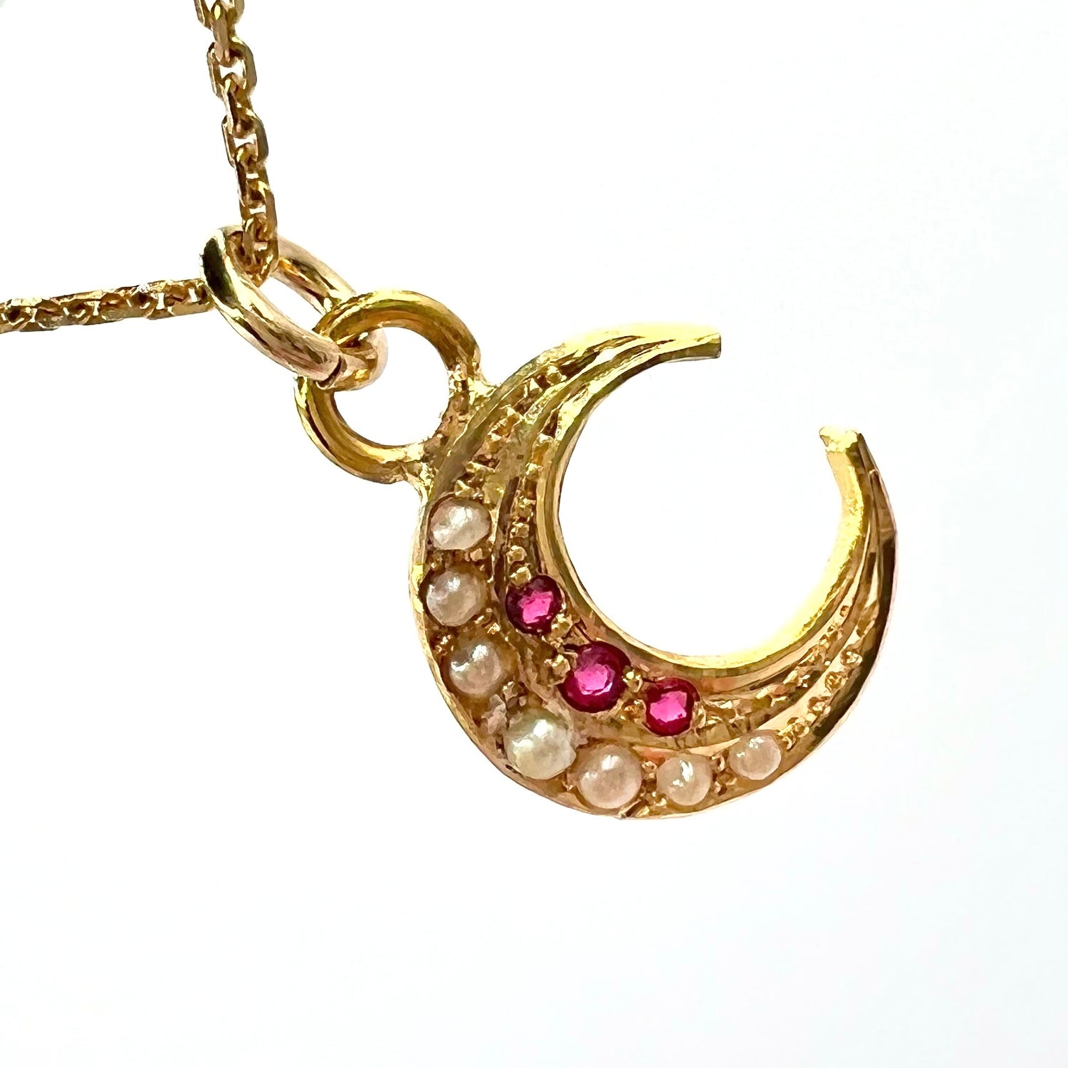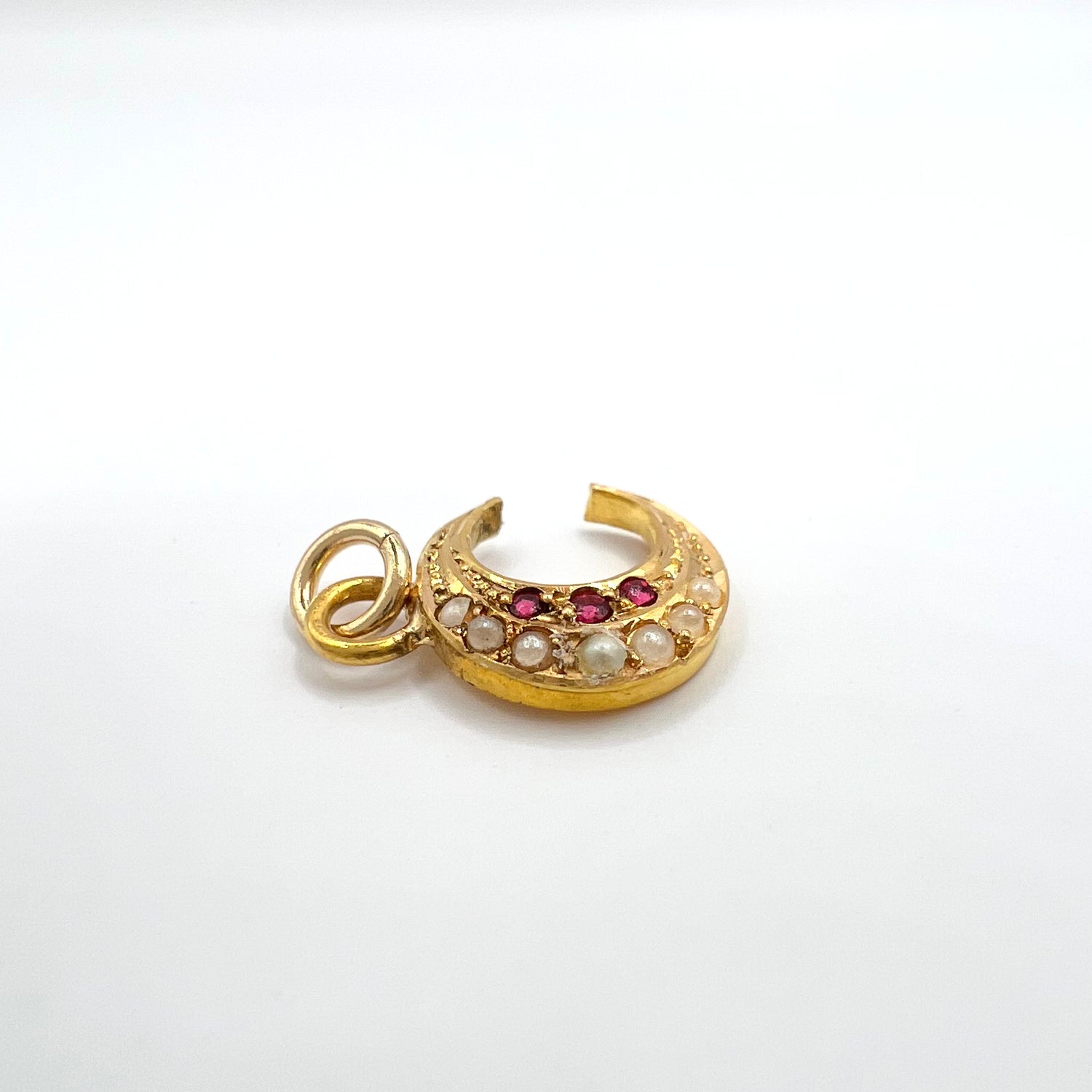 A beautiful small Antique Victorian 15 ct gold crescent moon charm pendant in fine vintage condition, featuring three small rubies and seven seed pearls with delicate gold detailing.