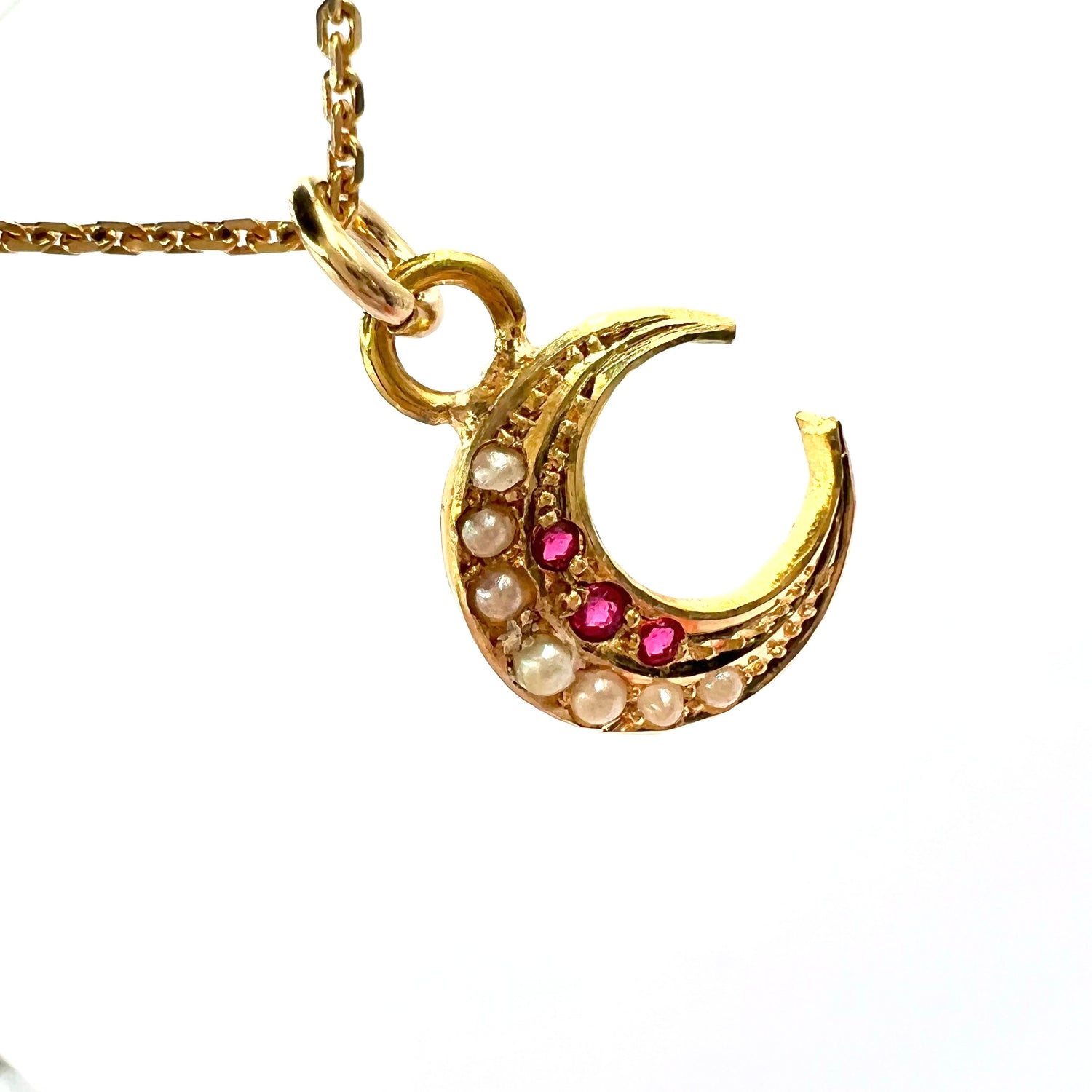 15ct Gold Ruby and Seed Pearl Crescent Charm Pendant