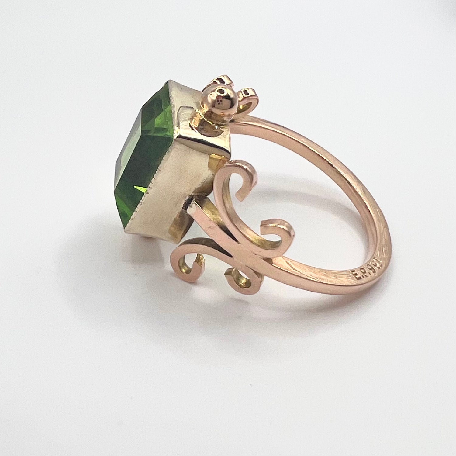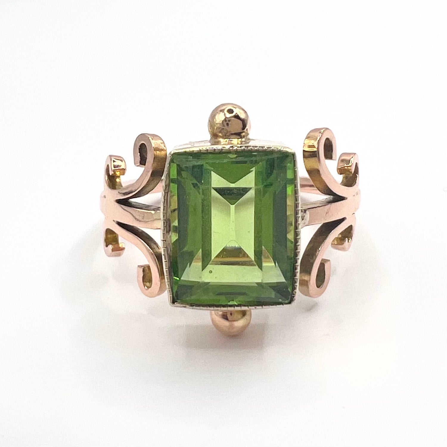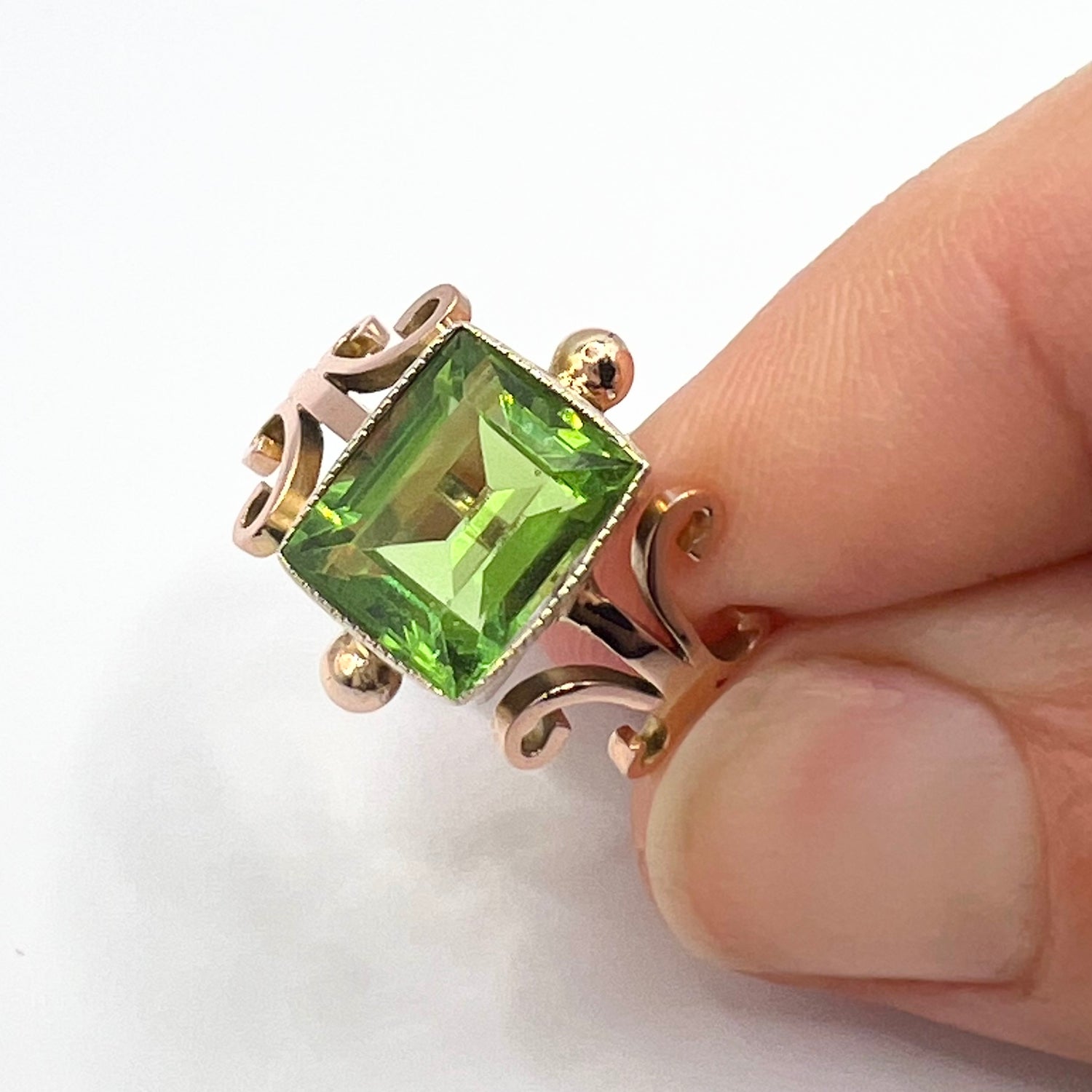 Part of the 'Reworked and Reimagined' collection, this is a gorgeous modern ring featuring a large emerald cut Peridot in a bezel setting within a rosey 9ct gold band. This beautiful piece has been created from an antique brooch, giving it a new lease of life.
