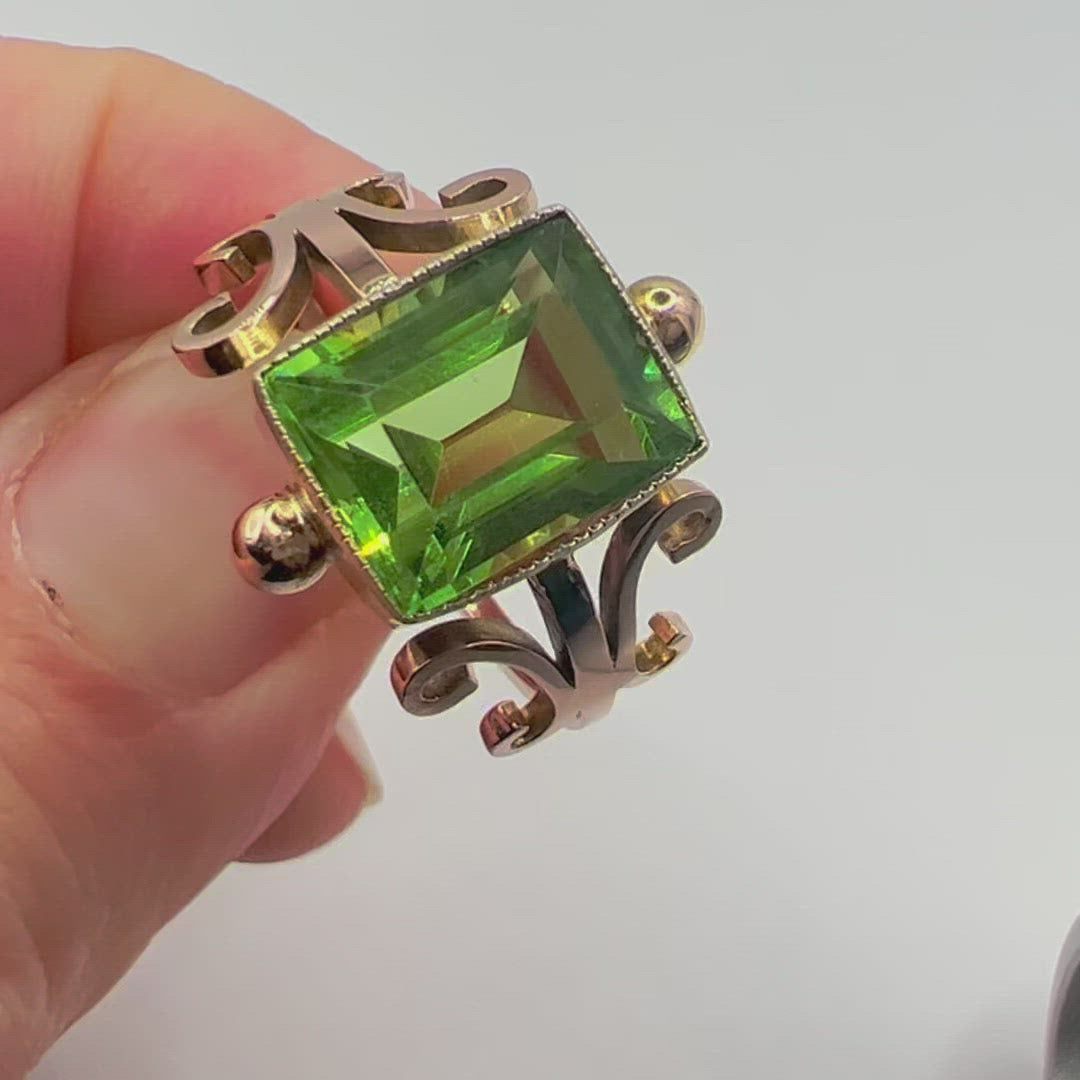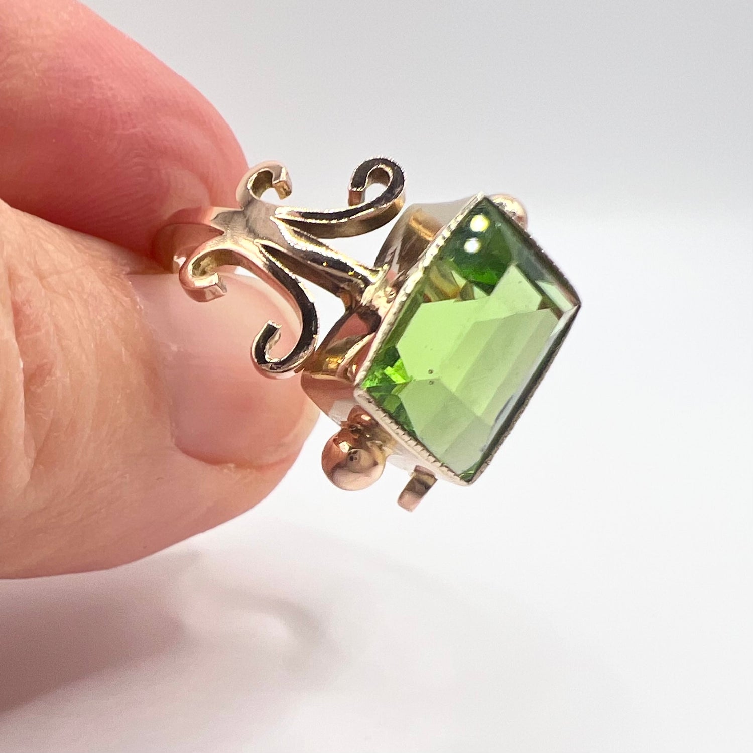 This unusual cocktail ring features a natural bright green peridot gemstone, measuring 10 mm x8 mm, approximately 2.7 carats. The large stone sits within a bezel, allowing plenty of light to pass through, highlighting the stone's clarity. An elegant ring with a unique history.