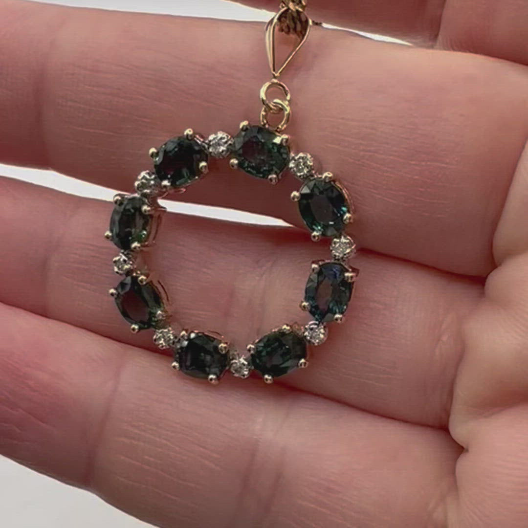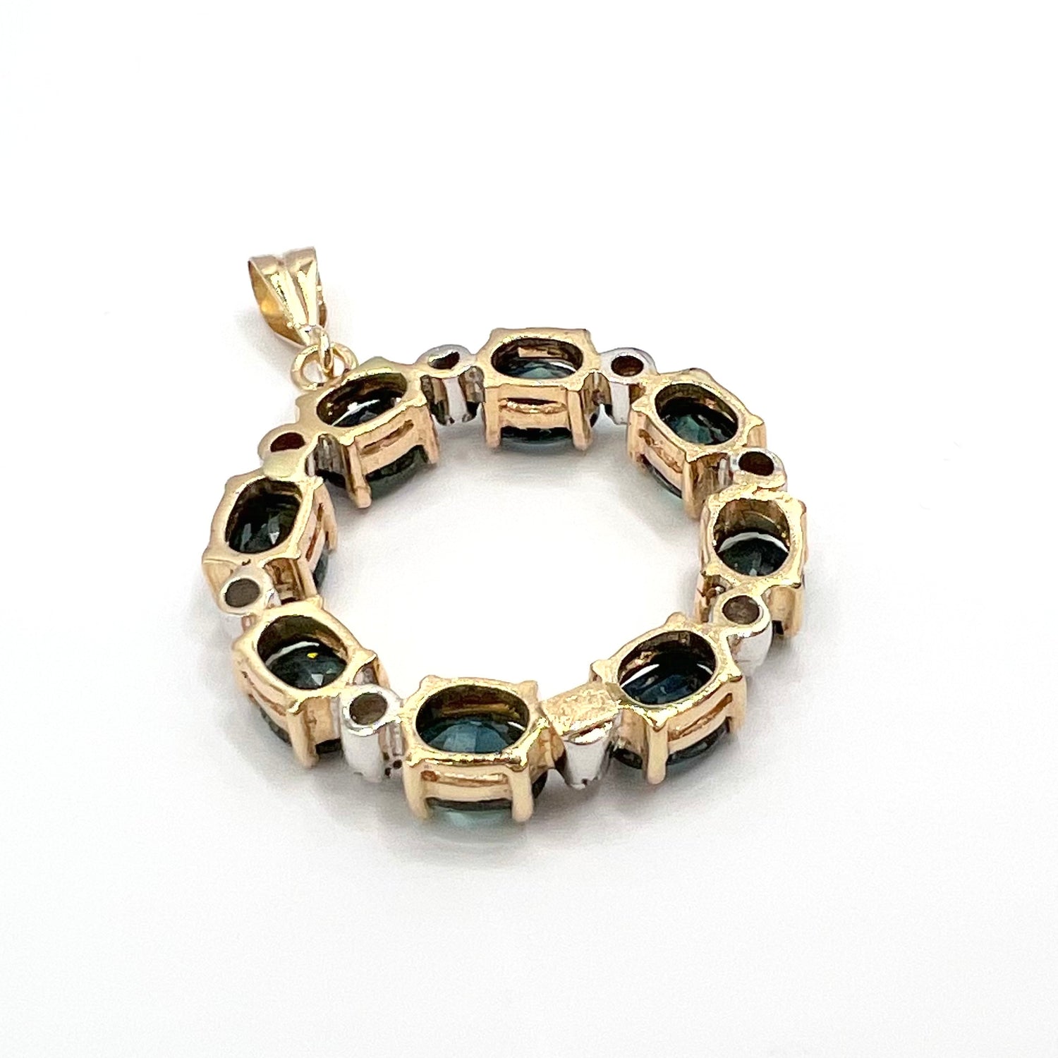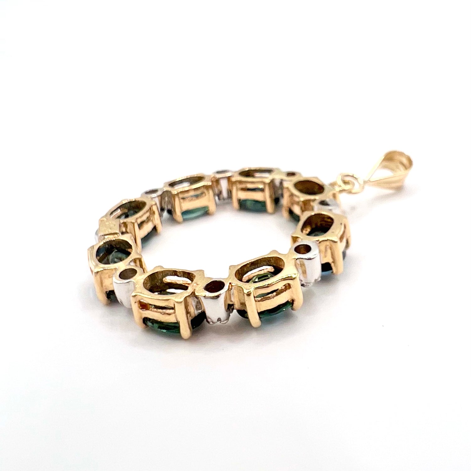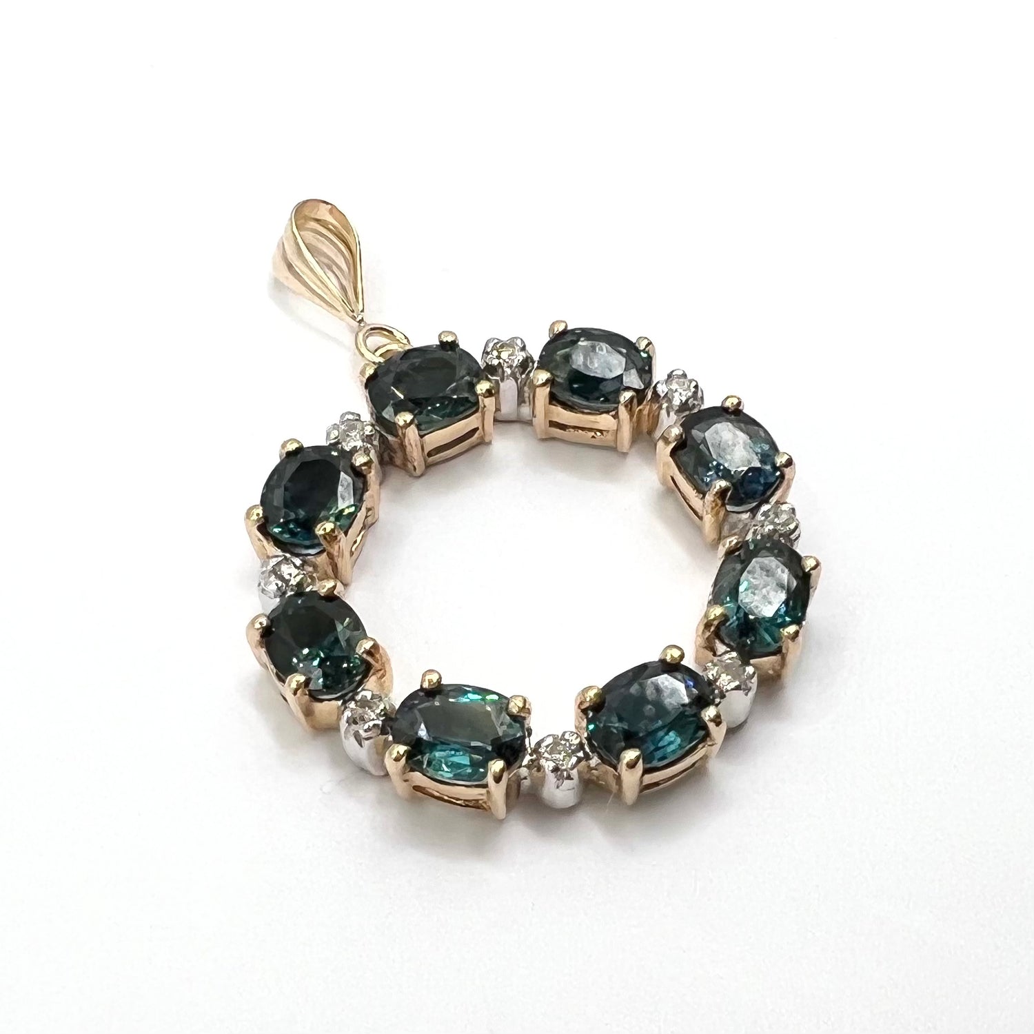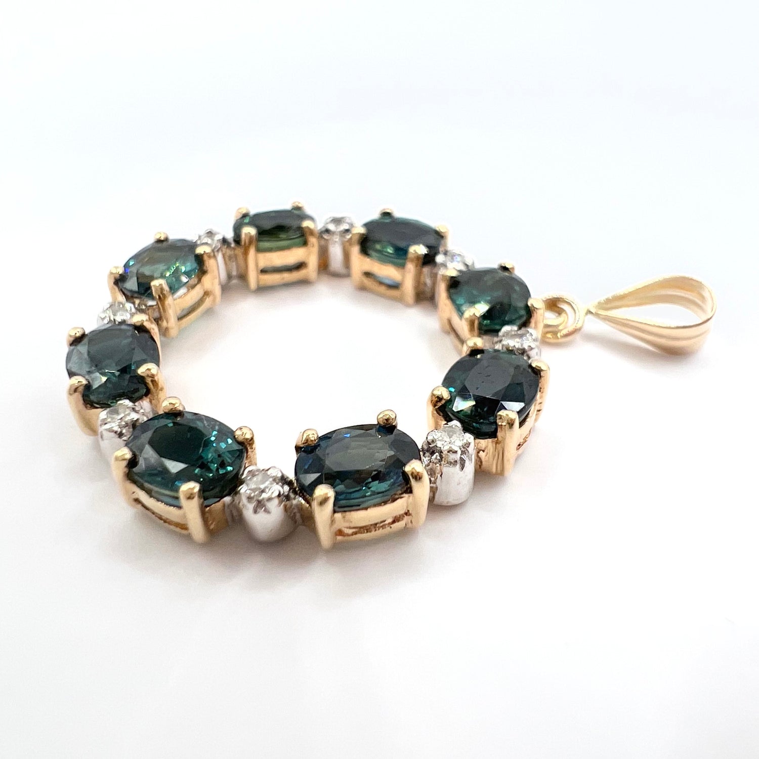 A beautiful sparkling 9ct gold pendant in fine vintage condition, featuring alternating well-saturated, oval cut sapphires and small brilliant diamonds in a rondel shape. Each sapphire measures 5.3 mm x 4 mm.