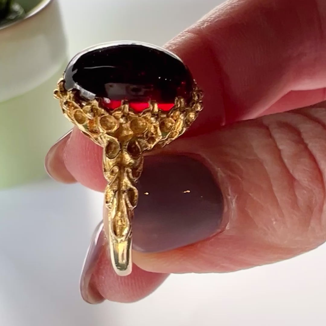 An antique 9ct gold garnet cocktail ring, set with an oval cabuchon garnet, with a decorative claw set mount, size M. A stunning and unique statement ring.