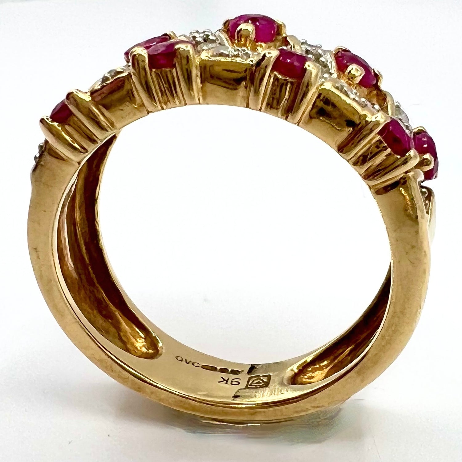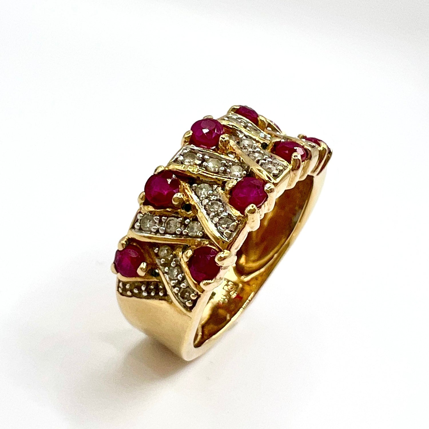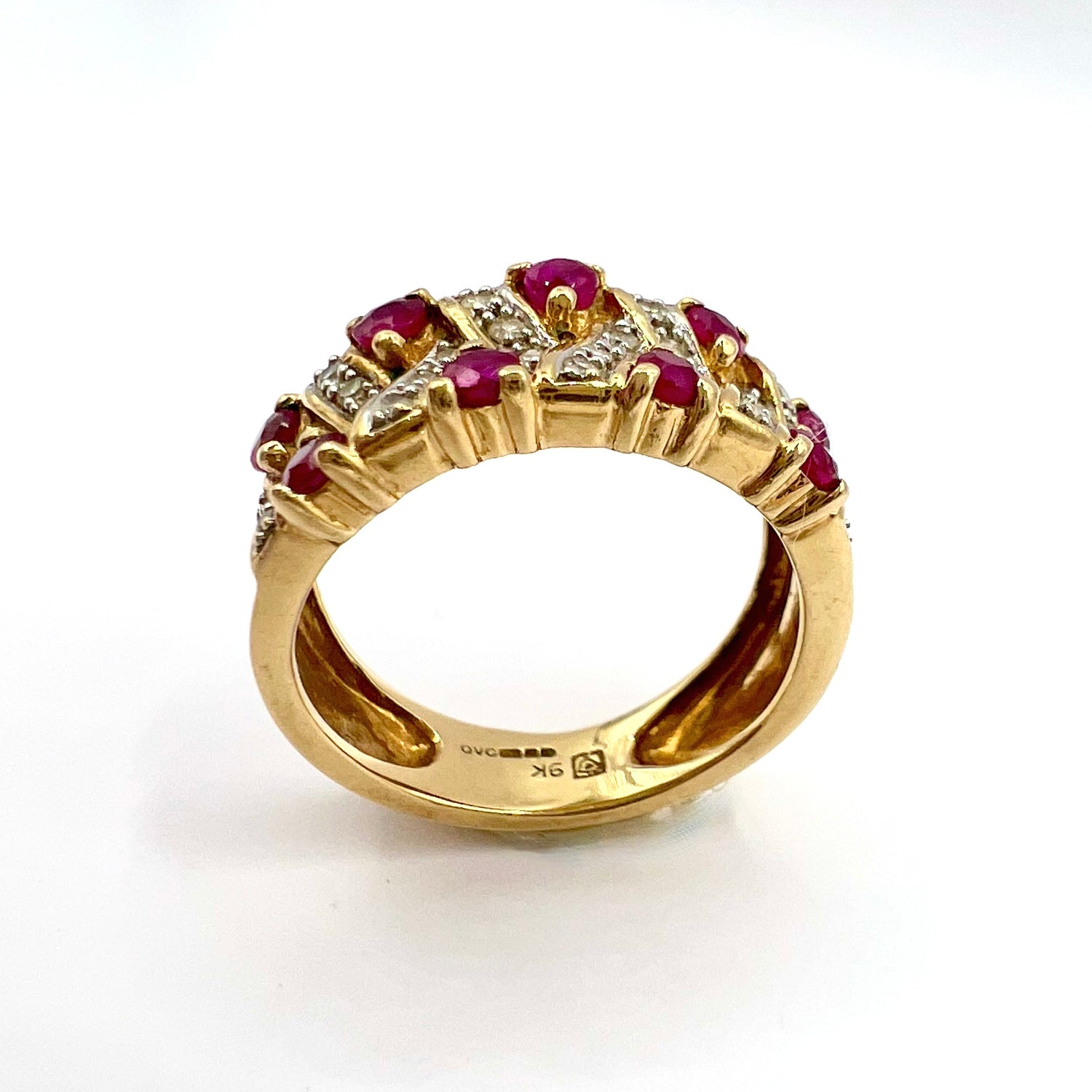 A 9ct gold ruby and diamond dress ring, set with 9 round rubies, and 24 brilliant cut diamonds, in an overlapping herringbone pattern, with an estimated total diamond weight of .15 carats.
