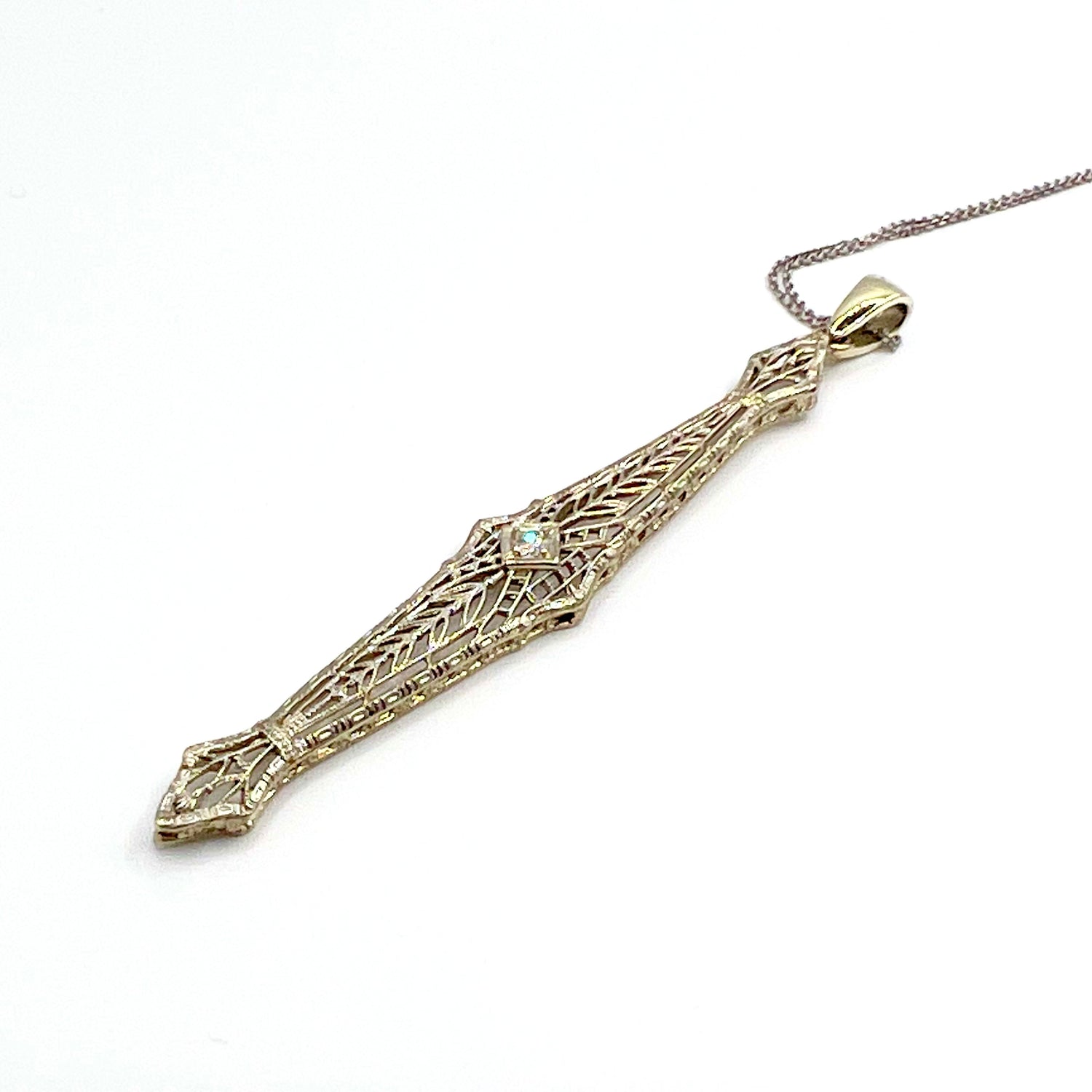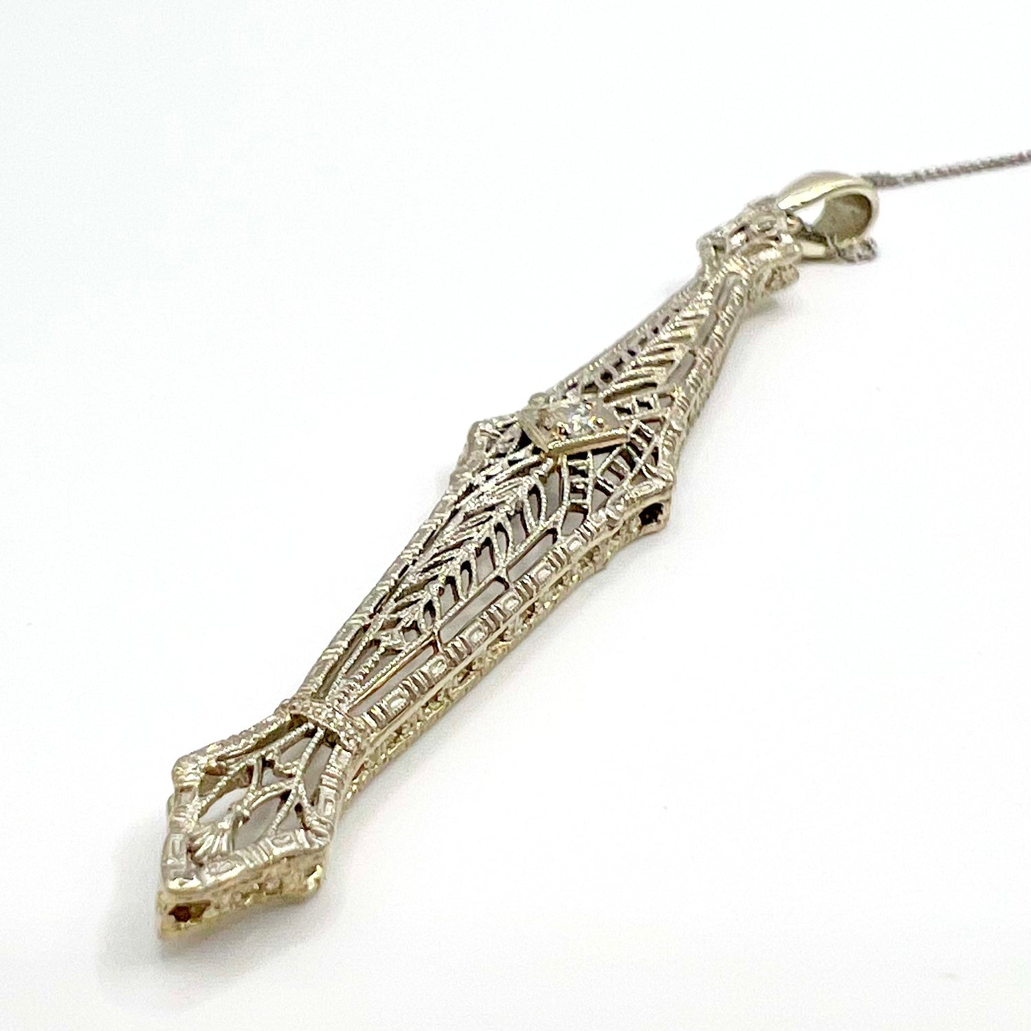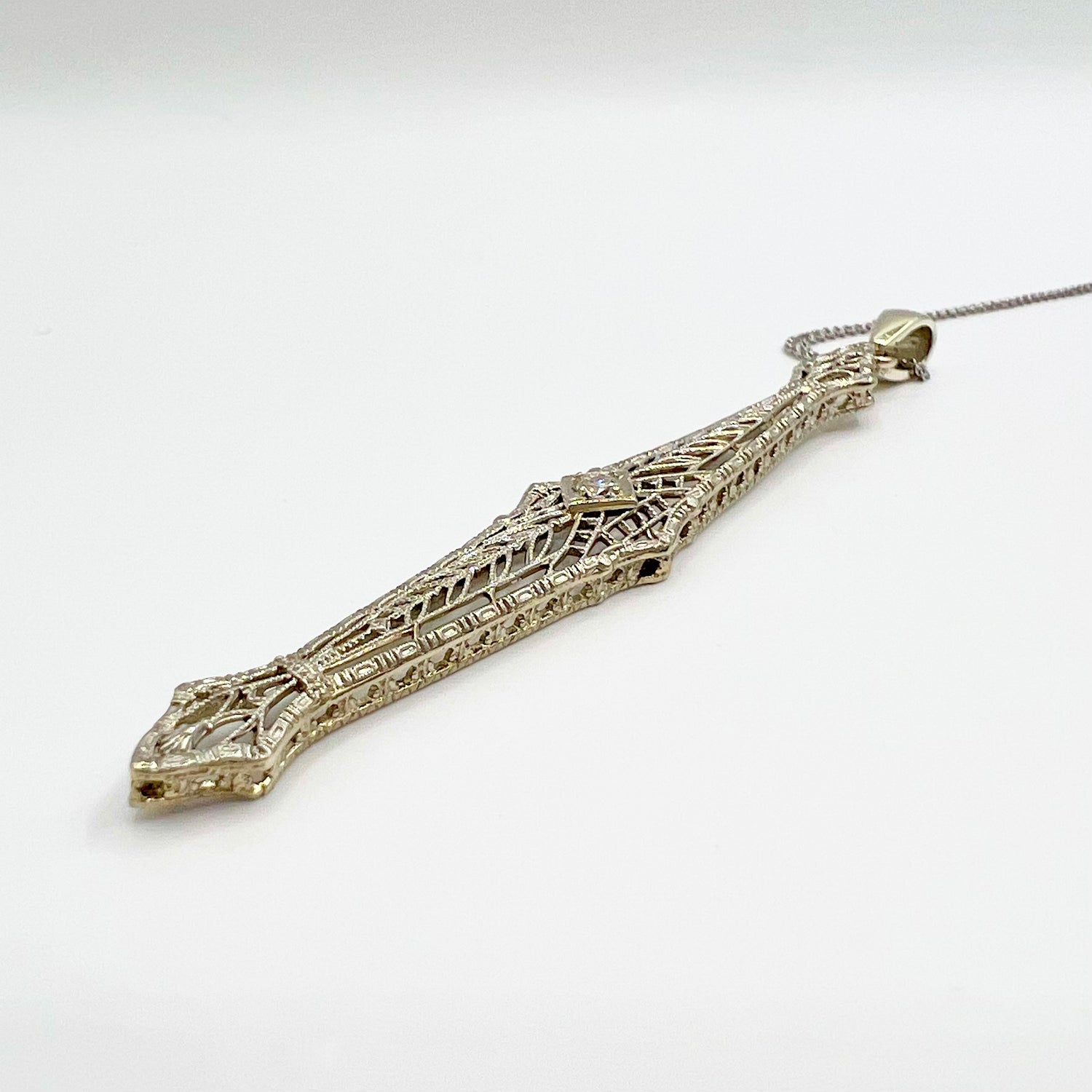 This unusual pendant has beautiful delicate filigree pattern in white gold, and hangs vertically, at 6.5 cm long x 1 cm wide, giving it a sophisticated and modern feel. It's an elegant pendant with a unique history.