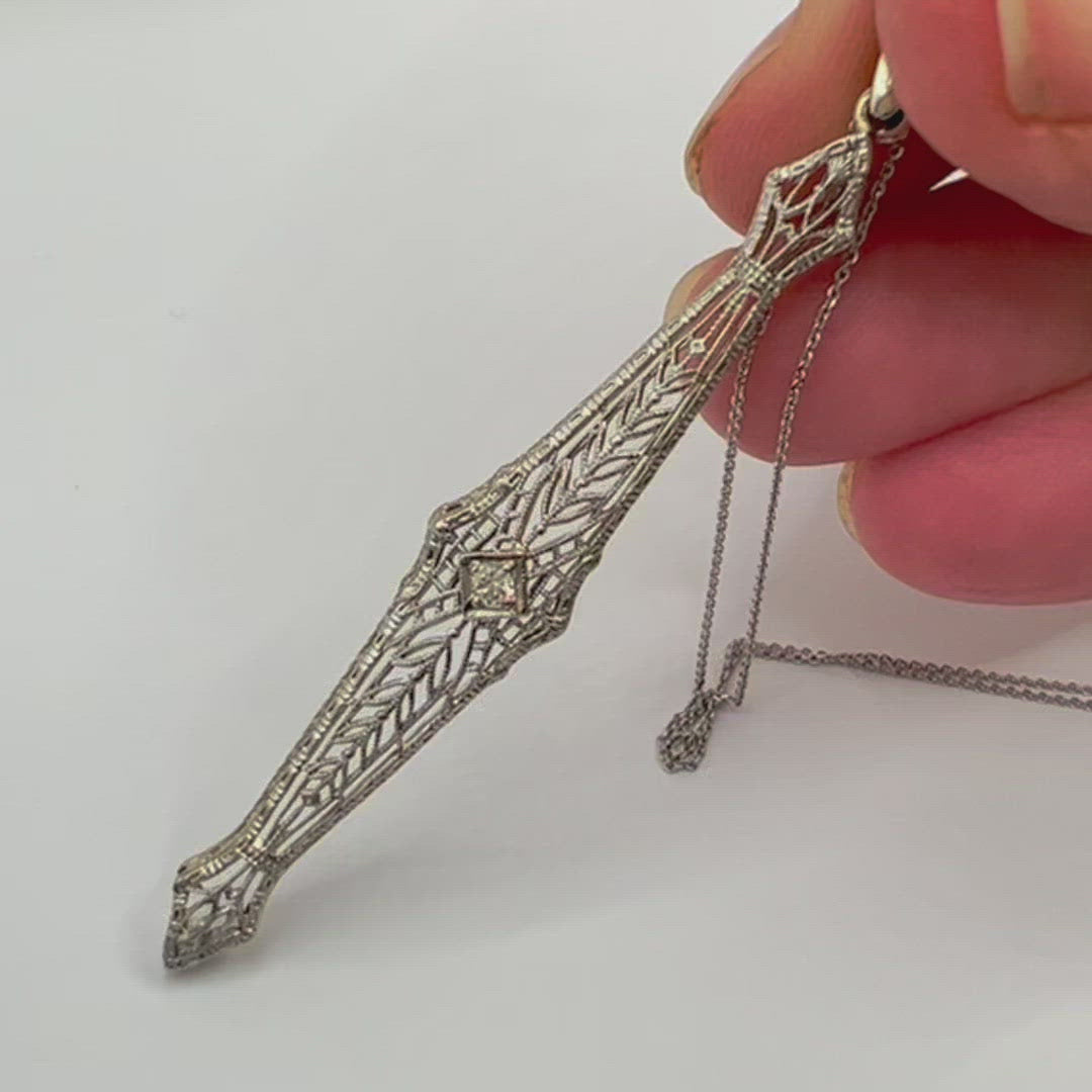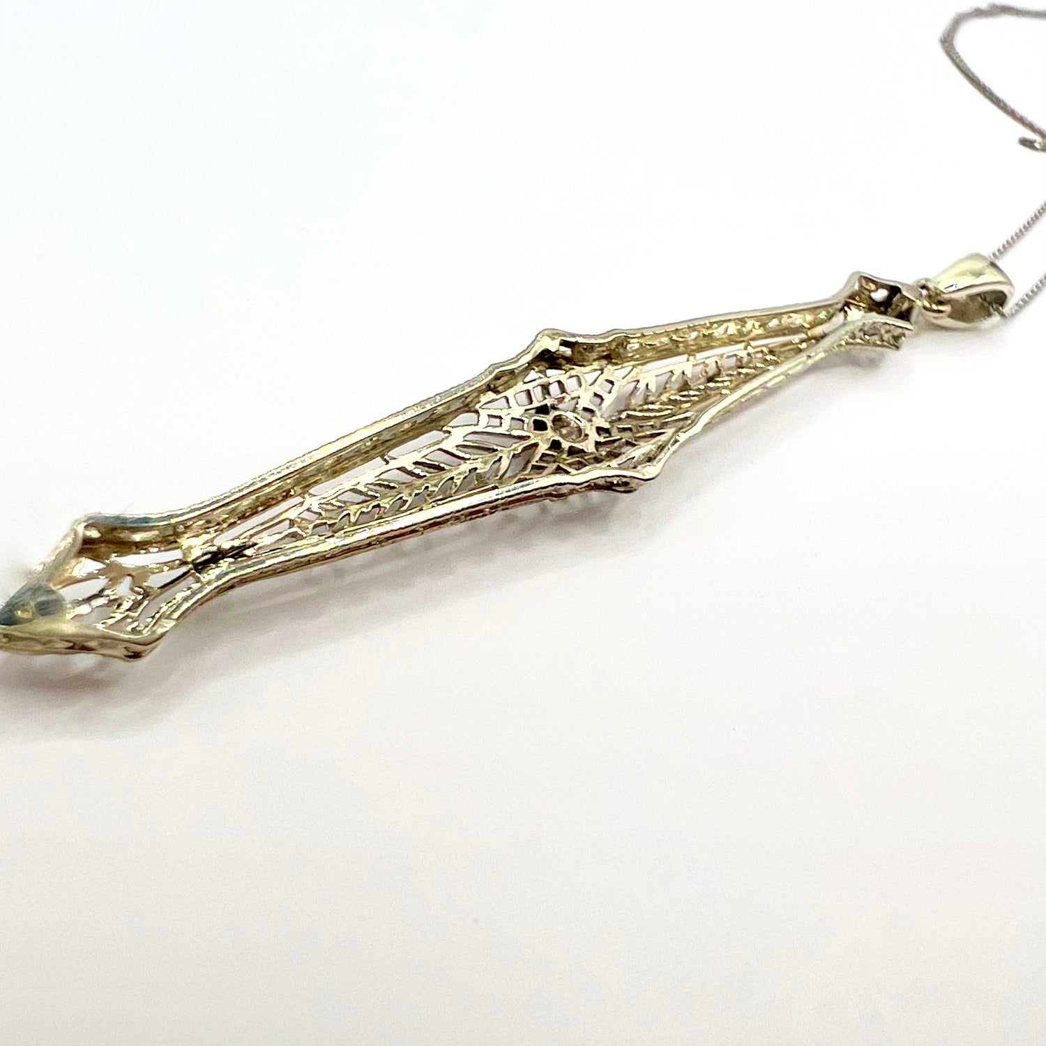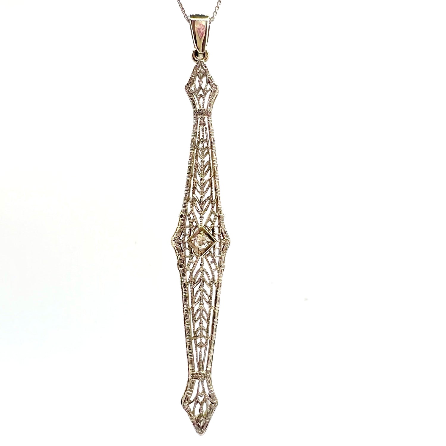 This unusual pendant has beautiful delicate filigree pattern in white gold, and hangs vertically, at 6.5 cm long x 1 cm wide, giving it a sophisticated and modern feel. It's an elegant pendant with a unique history.