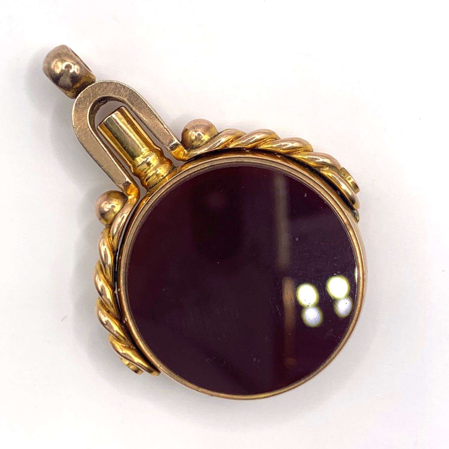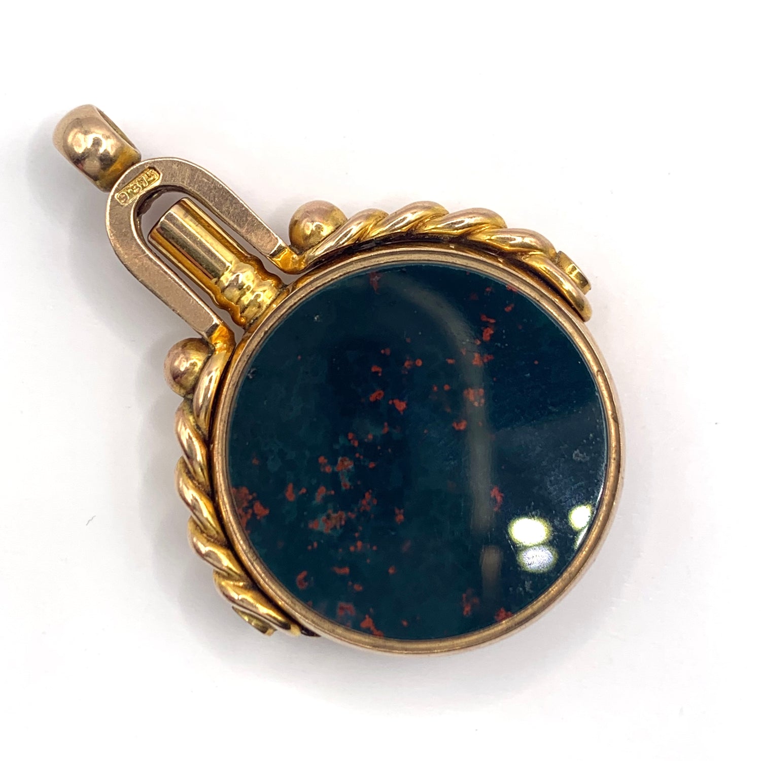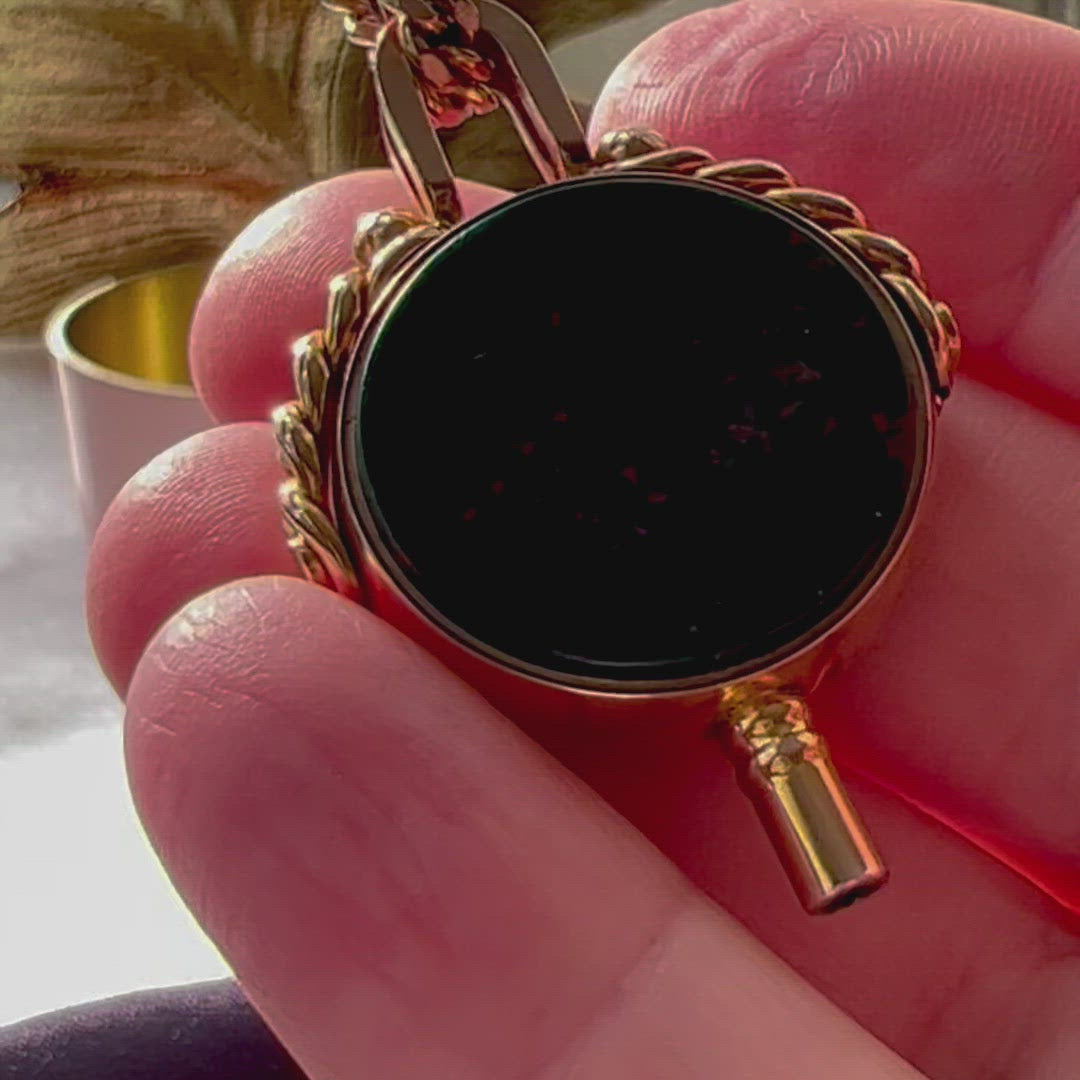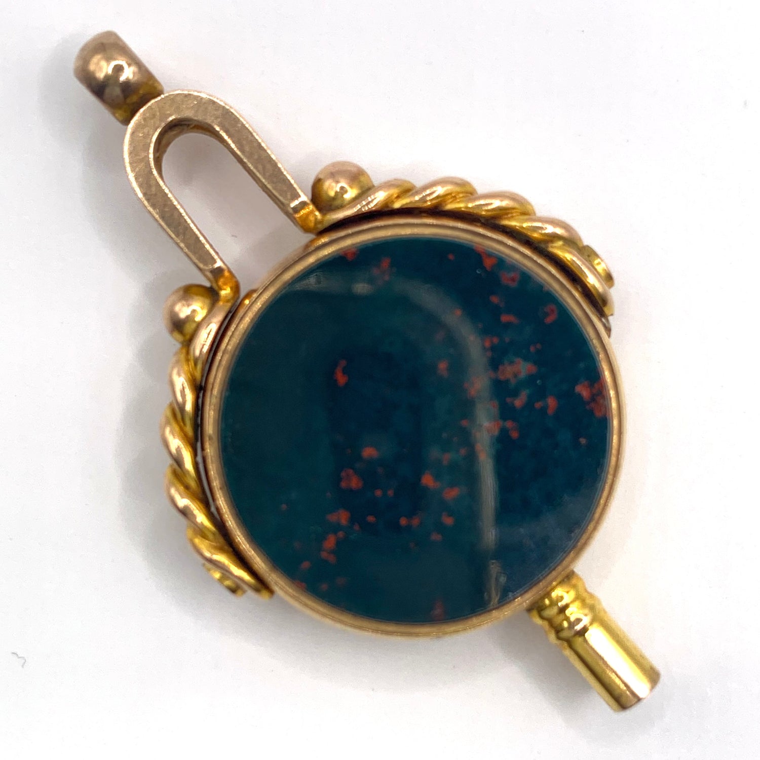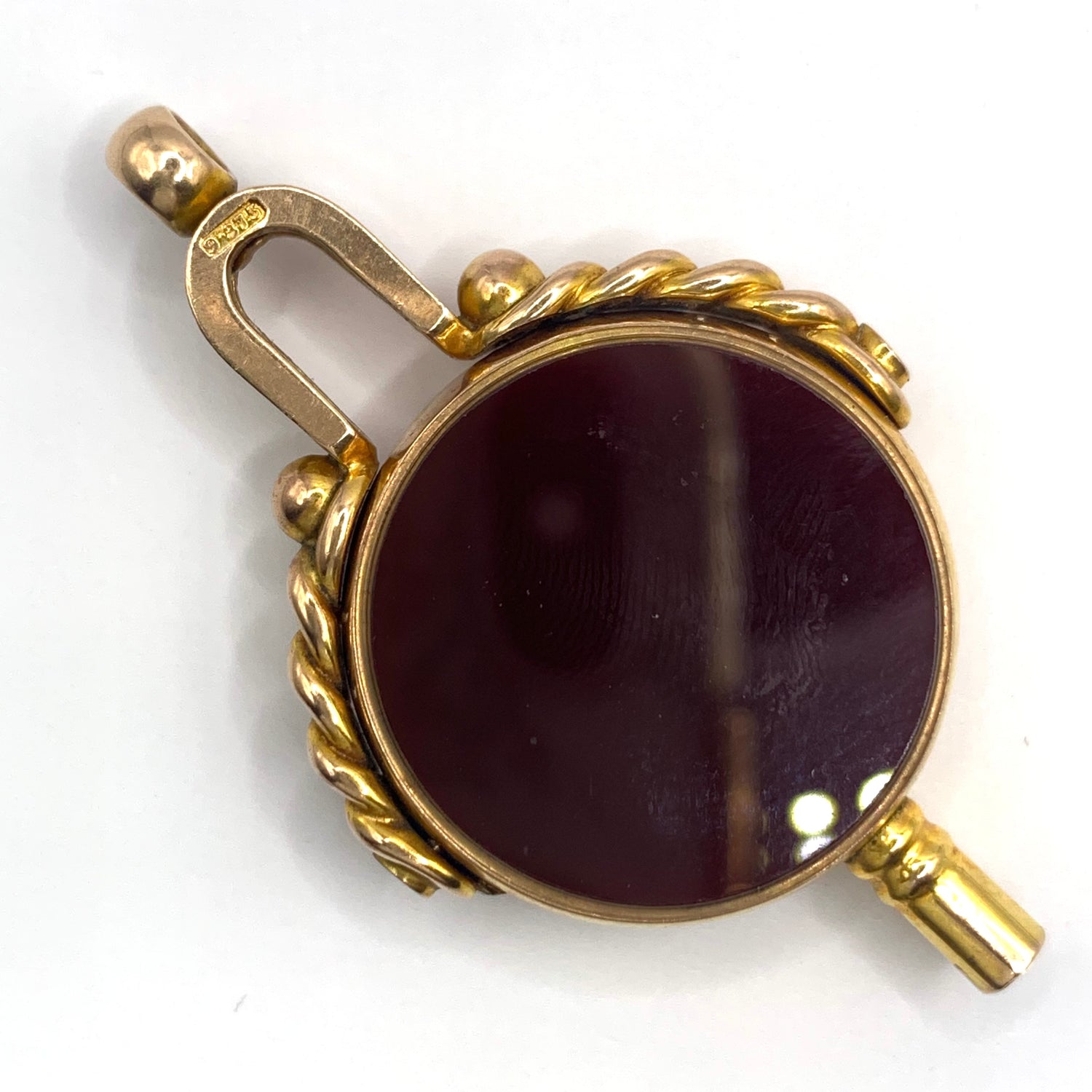 A large, rare 9ct gold Victorian Pocket Watch Fob Key Pendant. It features bloodstone and carnelian, and a twisted rope detail, and can be worn either open or closed.