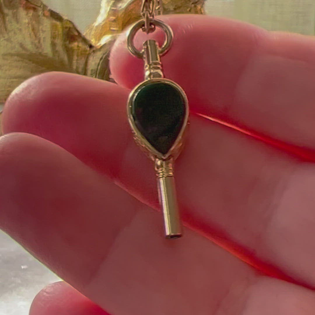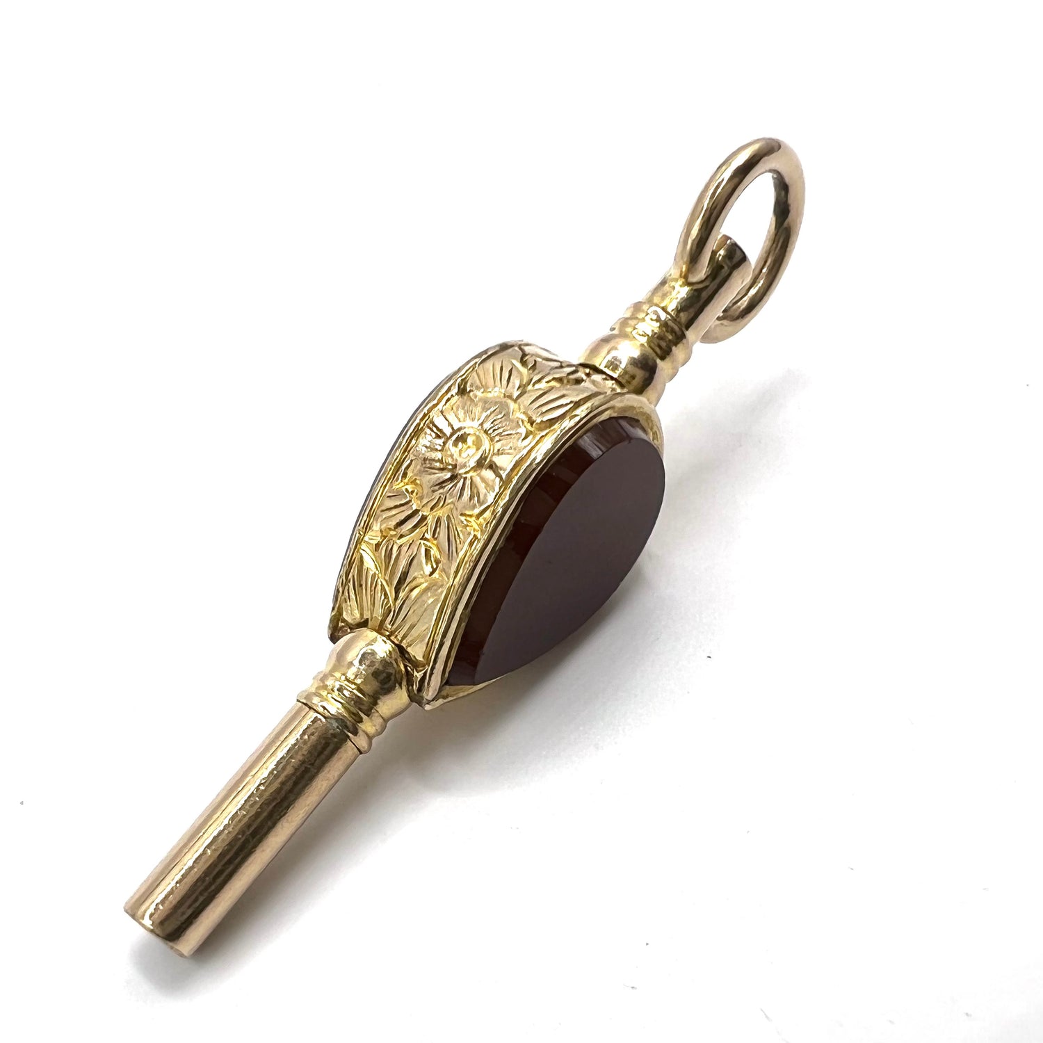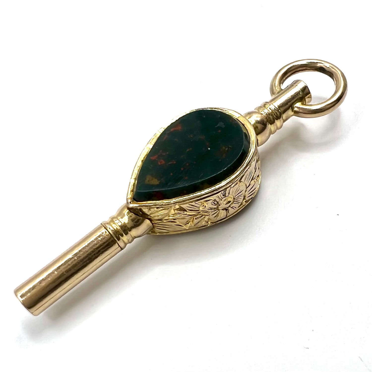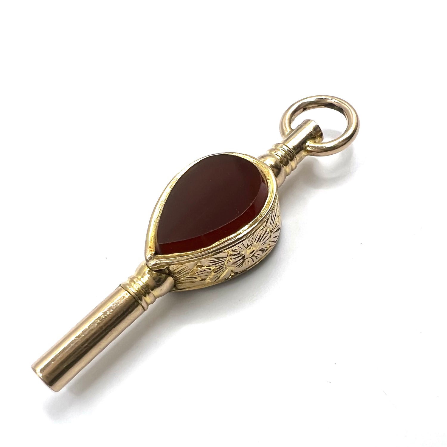 A solid 9ct gold teardrop shaped pocket watch key, featuring bloodstone and carnelian on alternate sides. Delicate floral scrolling on the sides. Looks beautiful on a gold chain, on its own or as part of a stack.