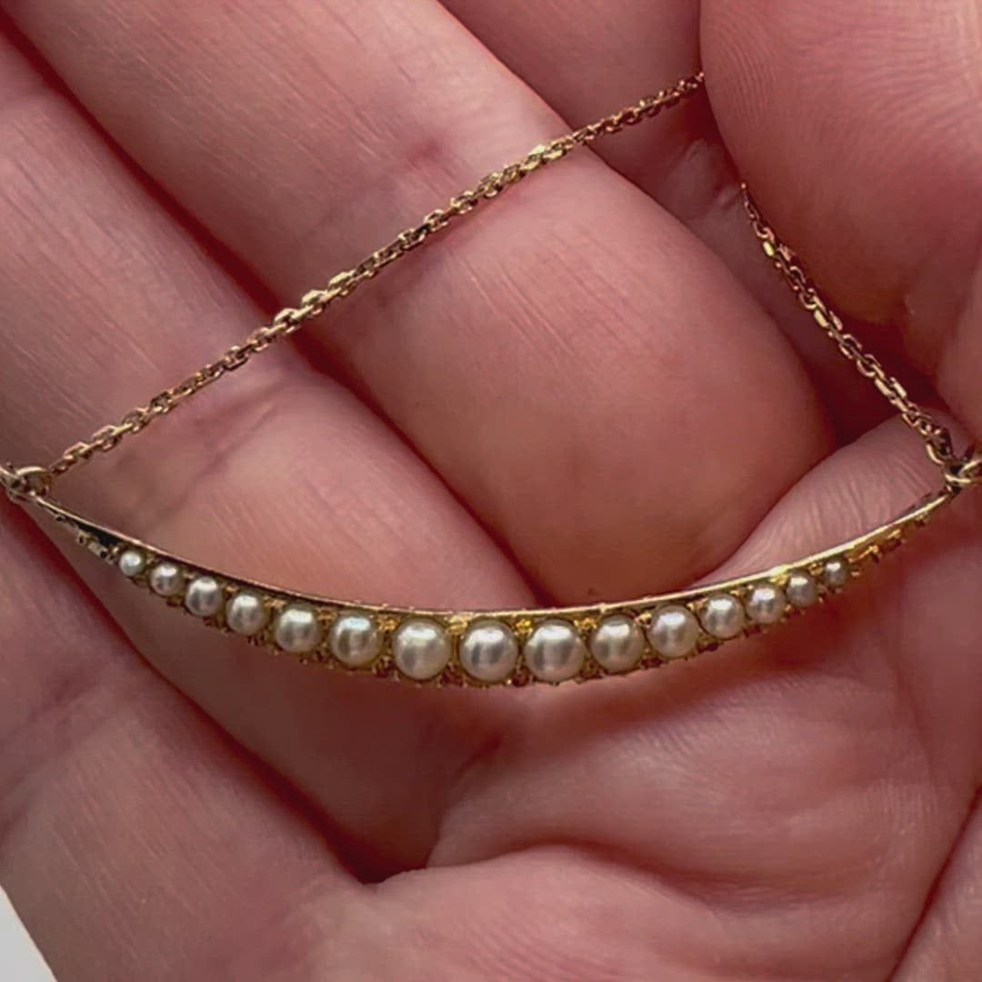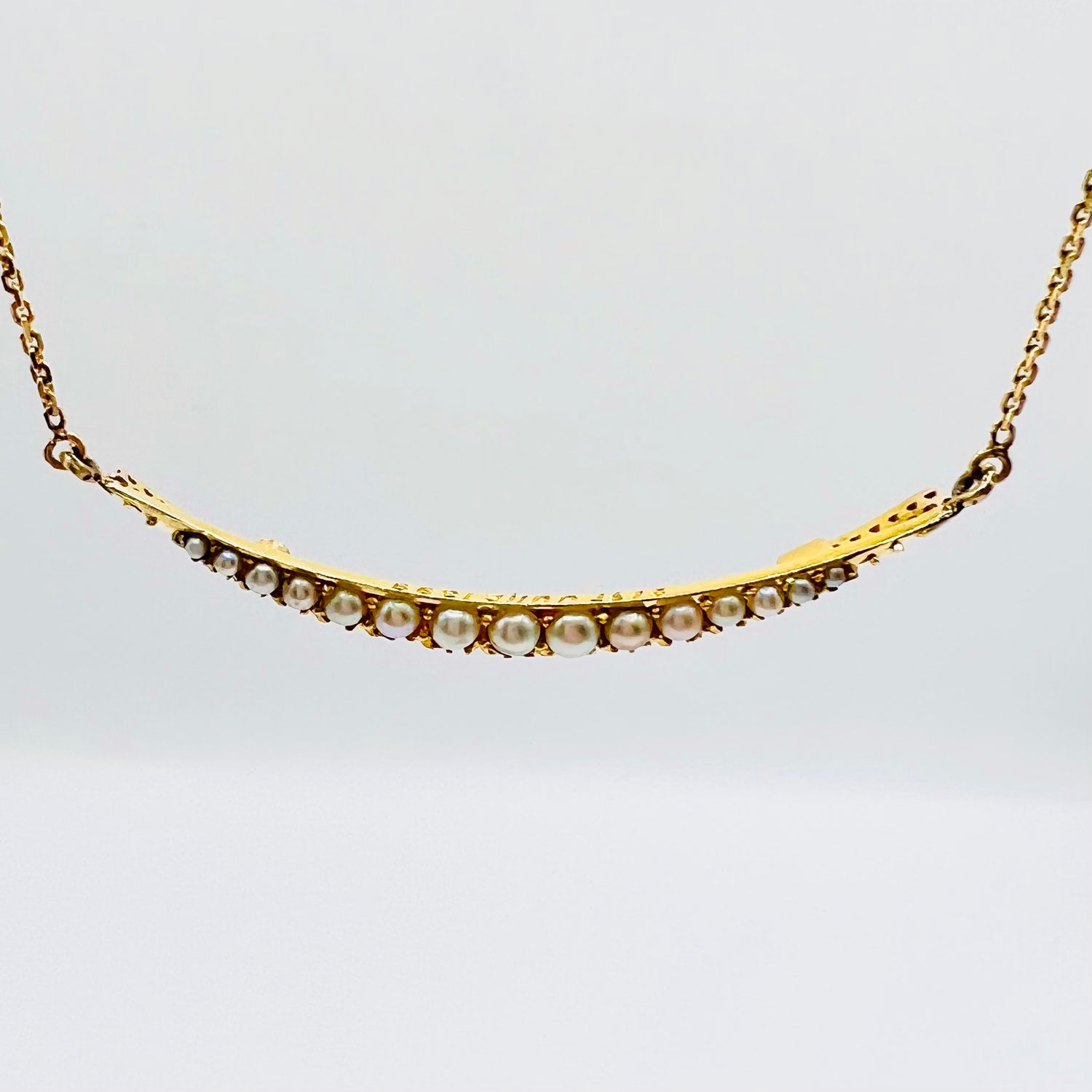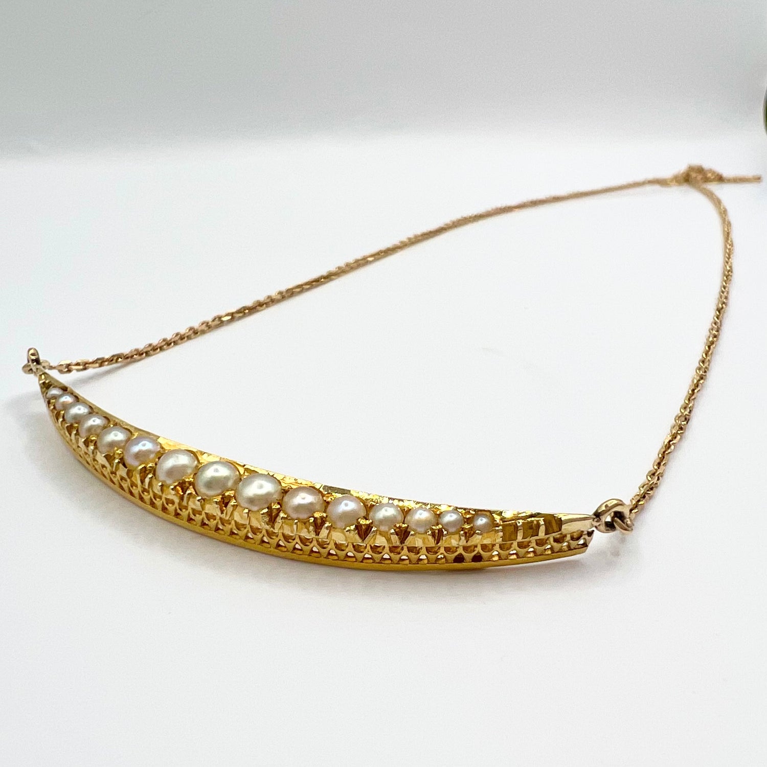 A beautiful antique Victorian 9ct gold open crescent moon necklace in fine vintage condition, featuring a row of graduated split pearls, grain set to the open crescent, engraved 21st June 1899.