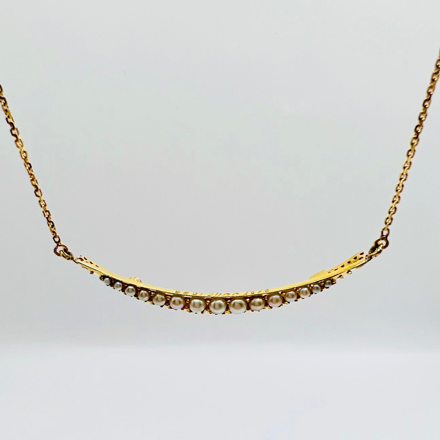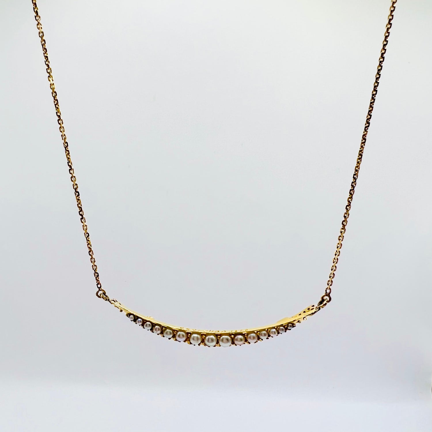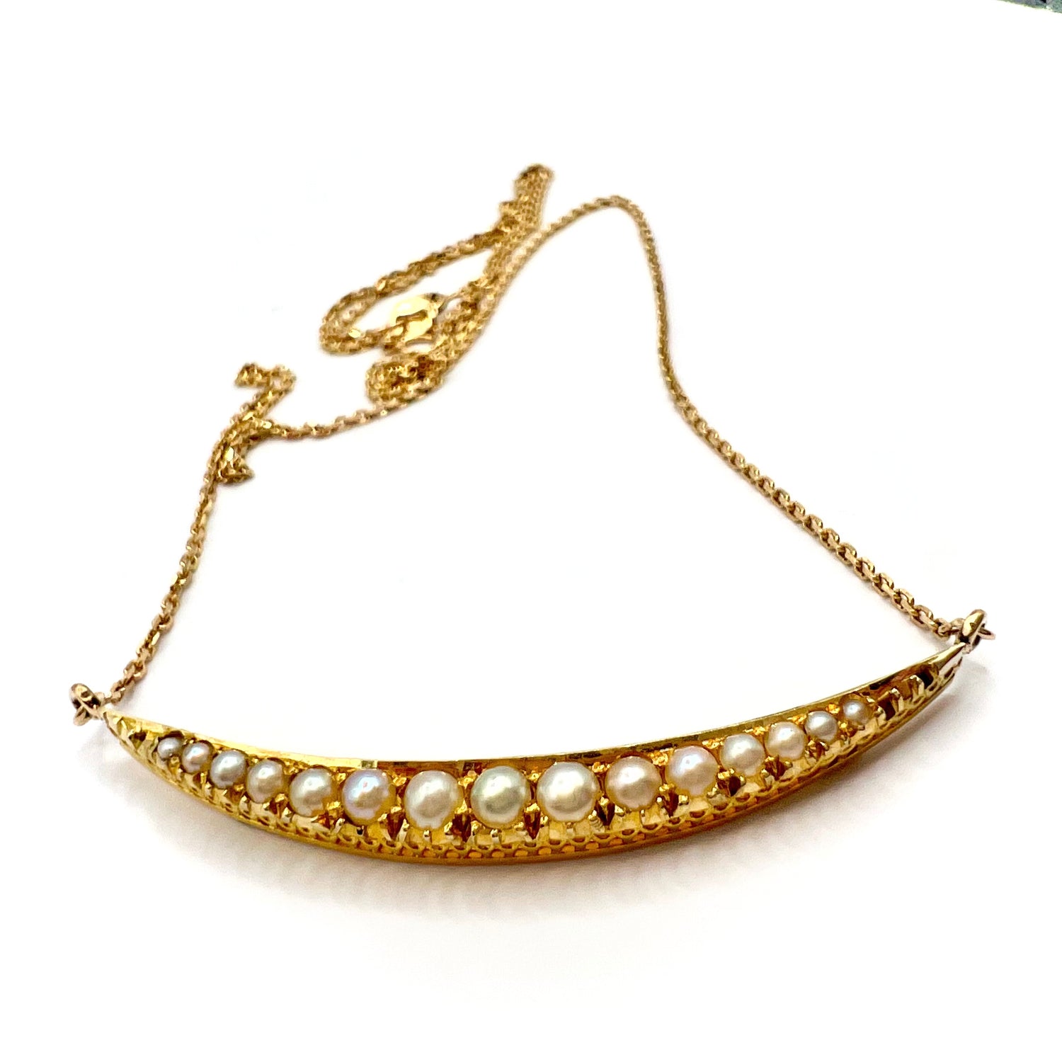 A beautiful antique Victorian 9ct gold open crescent moon necklace in fine vintage condition, featuring a row of graduated split pearls, grain set to the open crescent, engraved 21st June 1899.