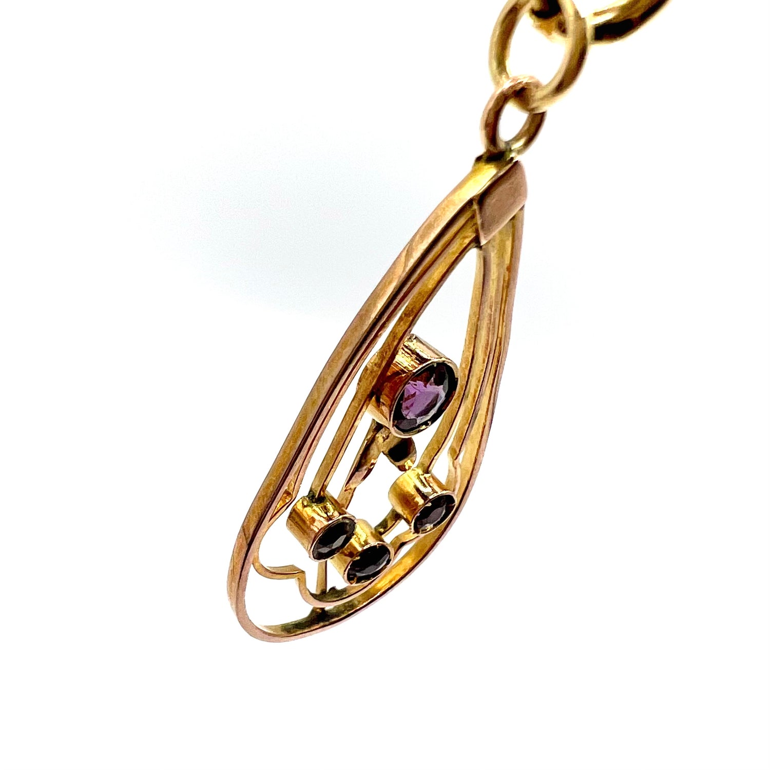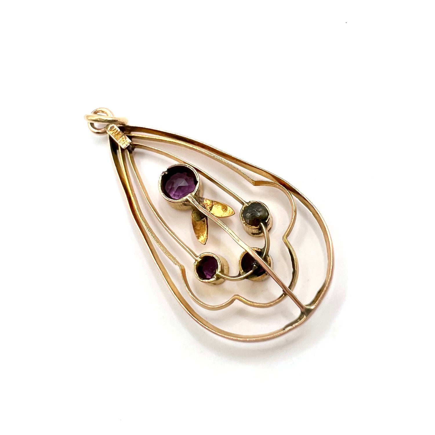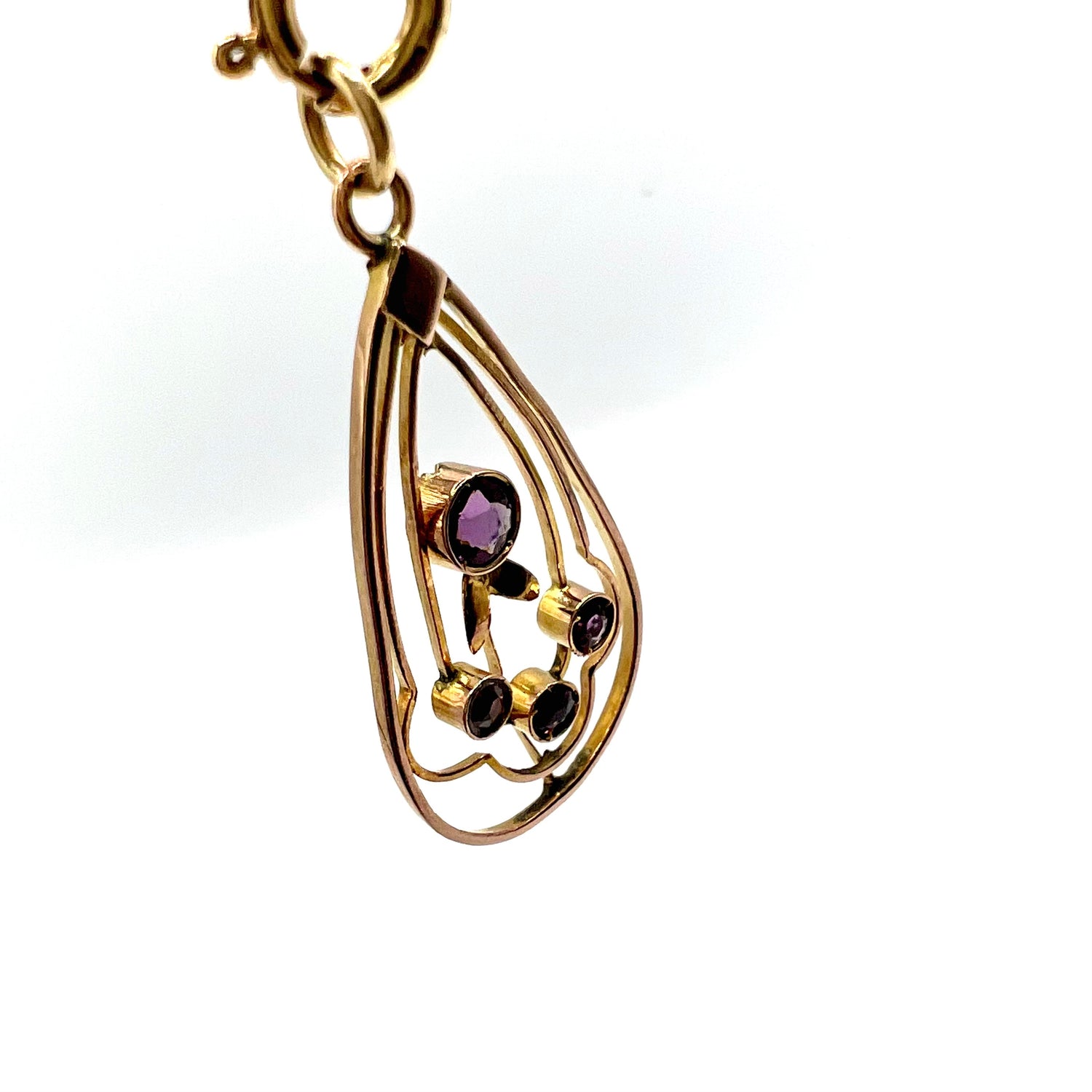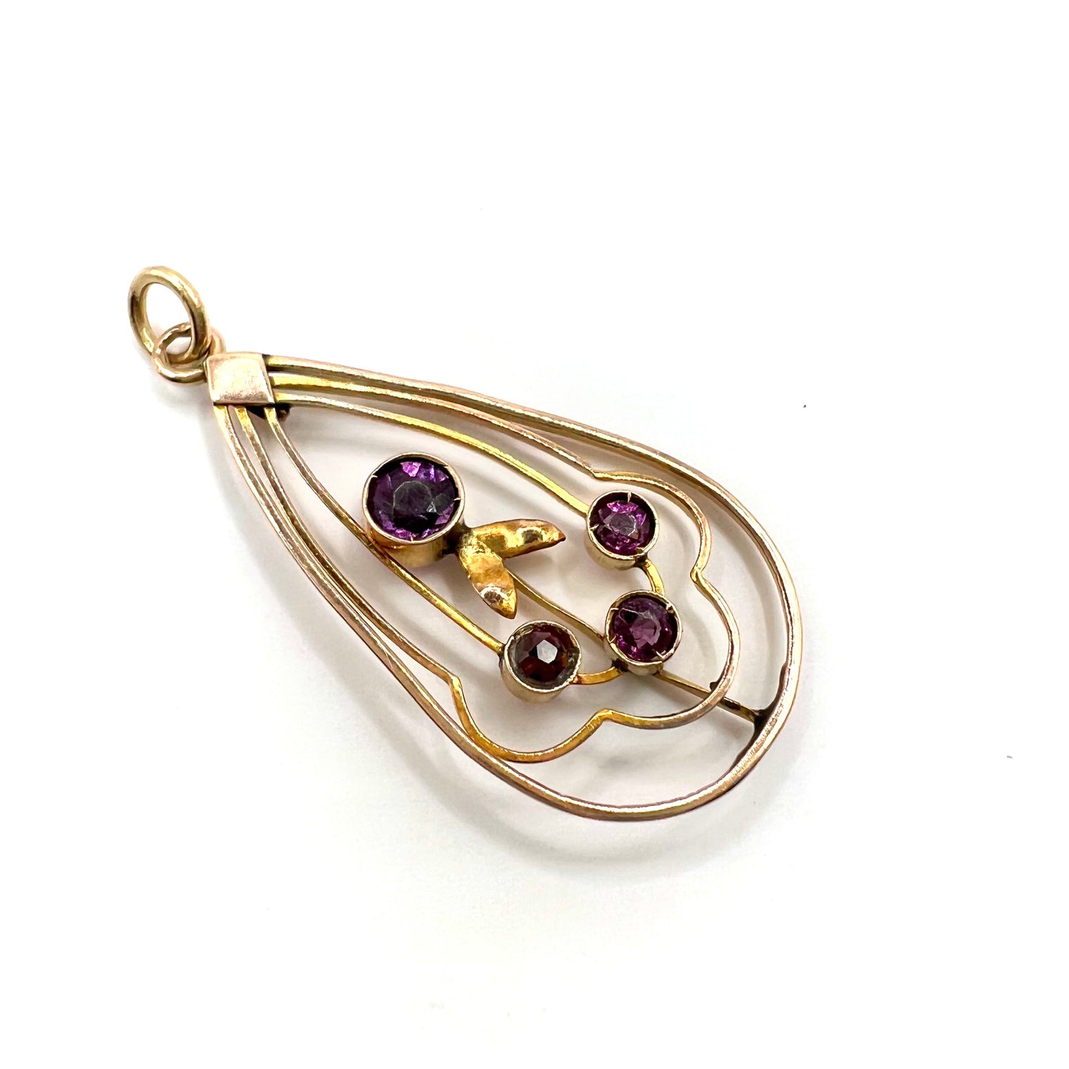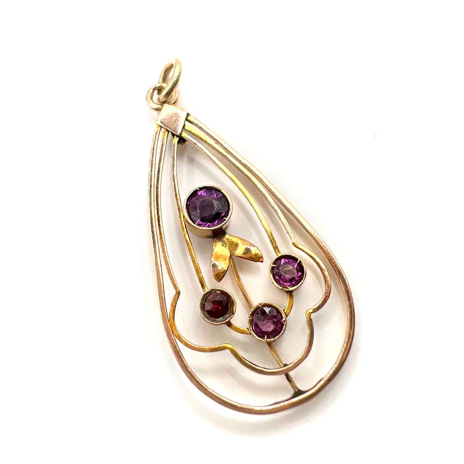 A lovely Art Nouveau pendant in 9ct gold, with a central circular amethyst, and three addition 3 round stones in a delicate floral setting.