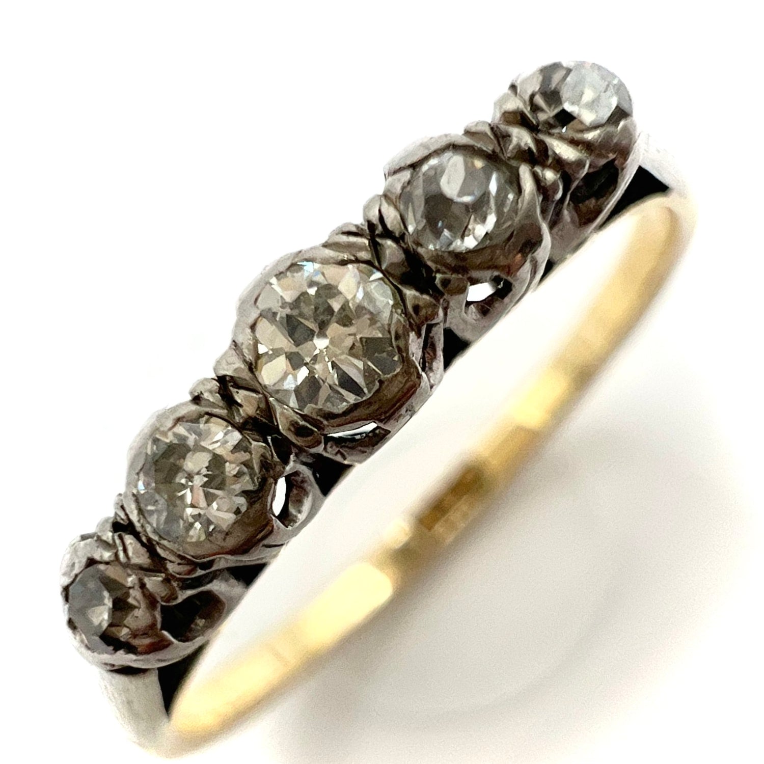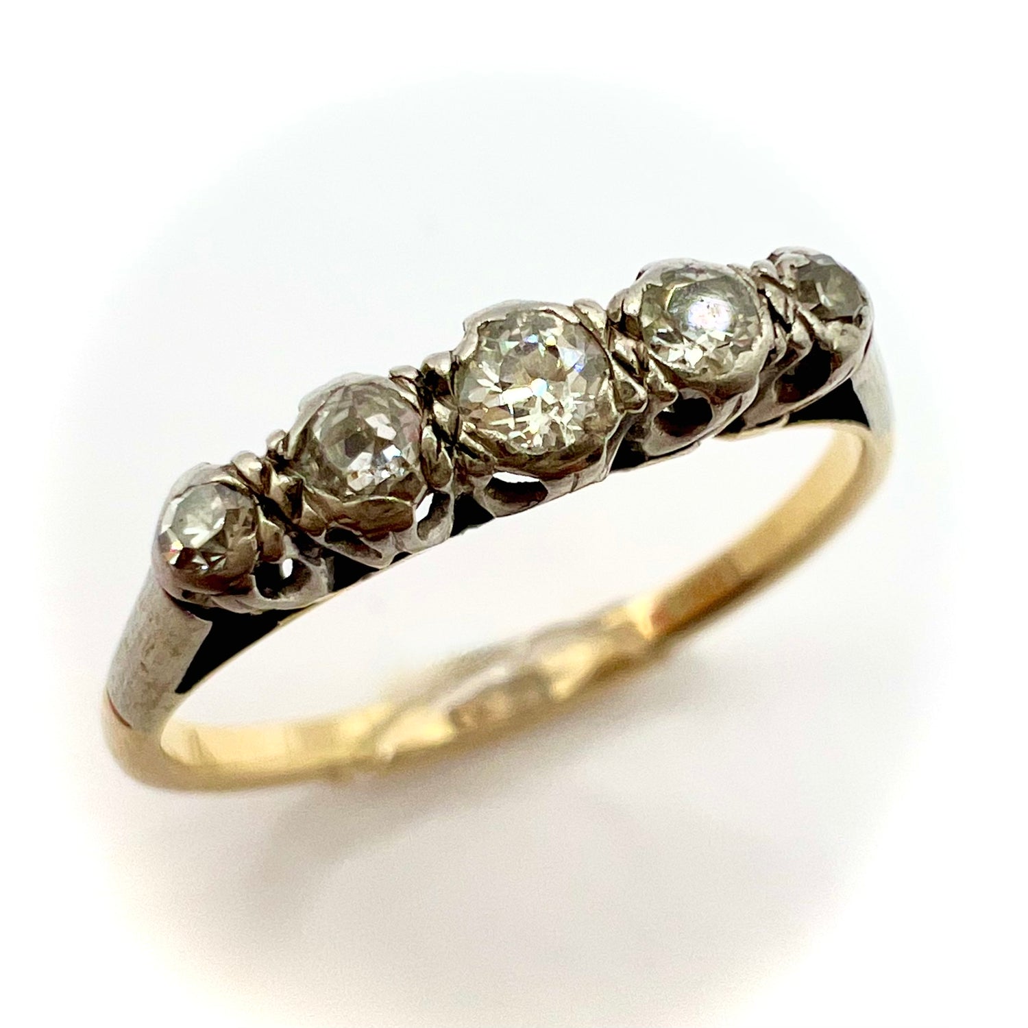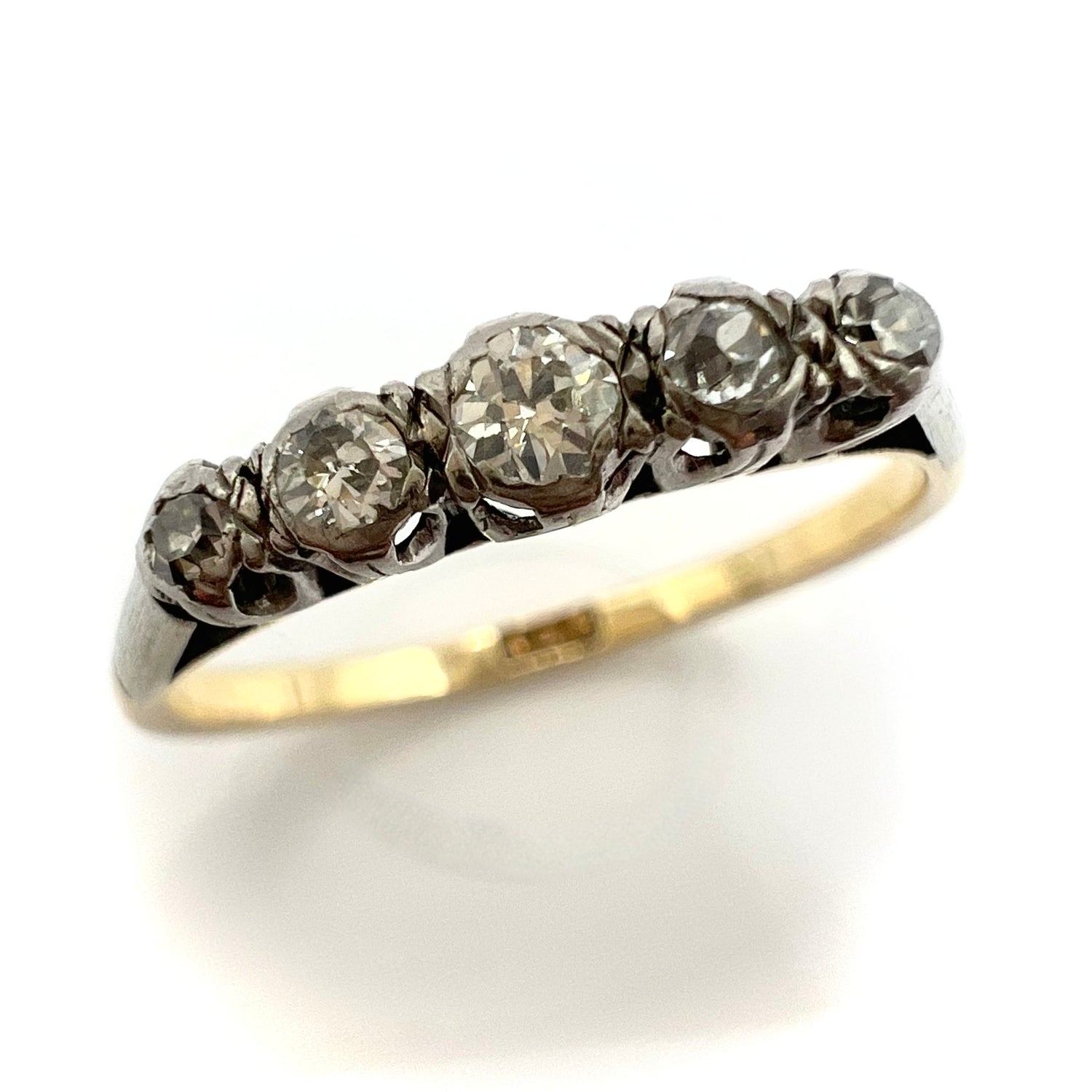 A Victorian 9ct gold and platinum ring, in fine vintage condition, set with five graduated small round old cut/European cut sparkling diamonds, featuring a larger central stone with a graduating diamonds on either side in an illusion setting. Estimated total weight is .3 ct.