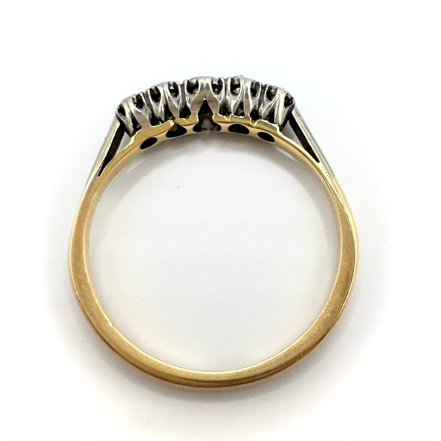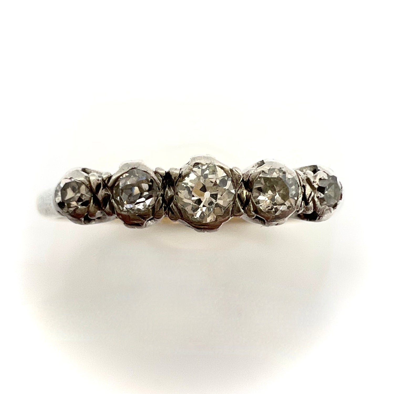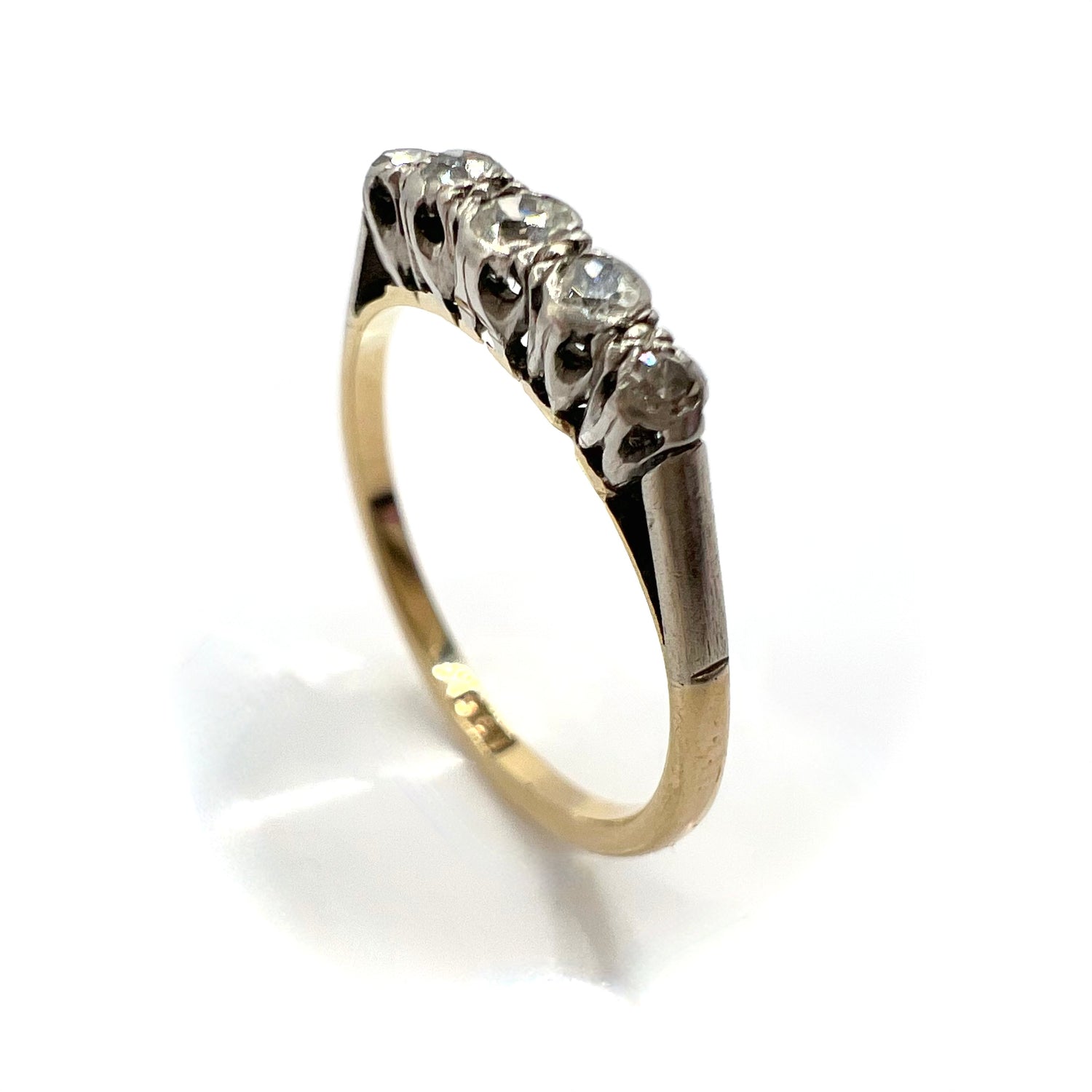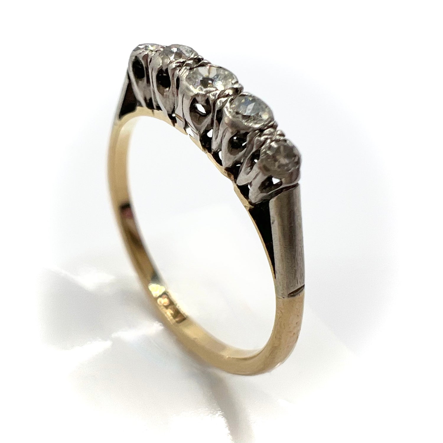 A Victorian 9ct gold and platinum ring, in fine vintage condition, set with five graduated small round old cut/European cut sparkling diamonds, featuring a larger central stone with a graduating diamonds on either side in an illusion setting. Estimated total weight is .3 ct.