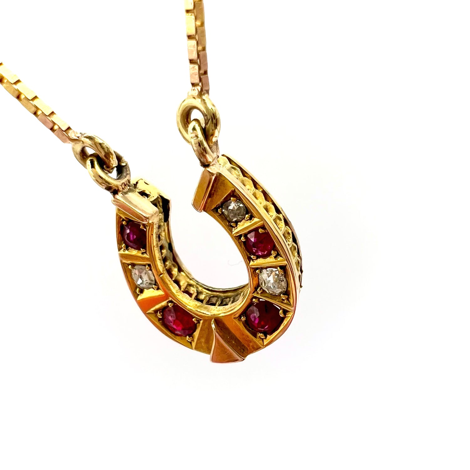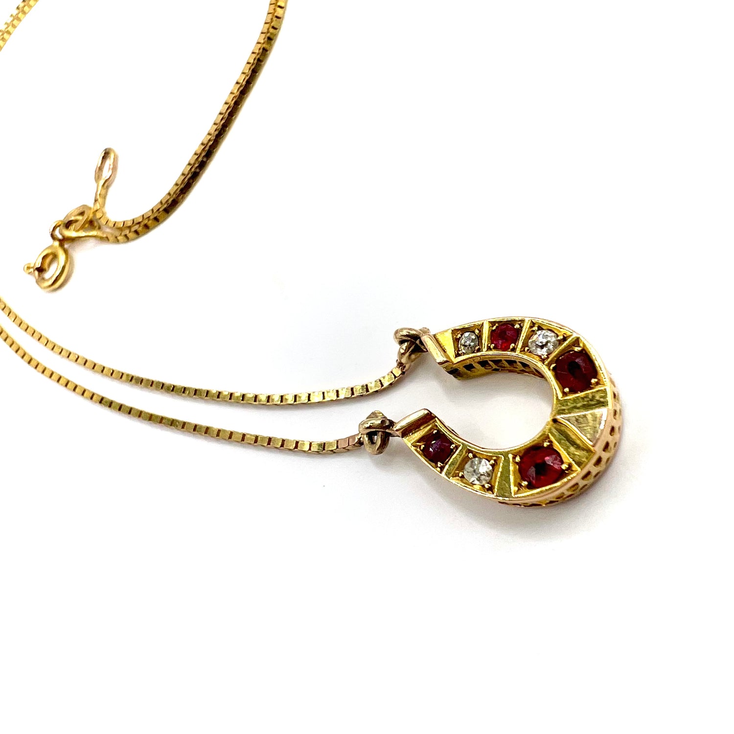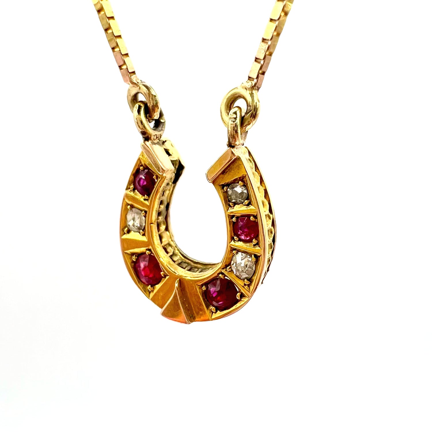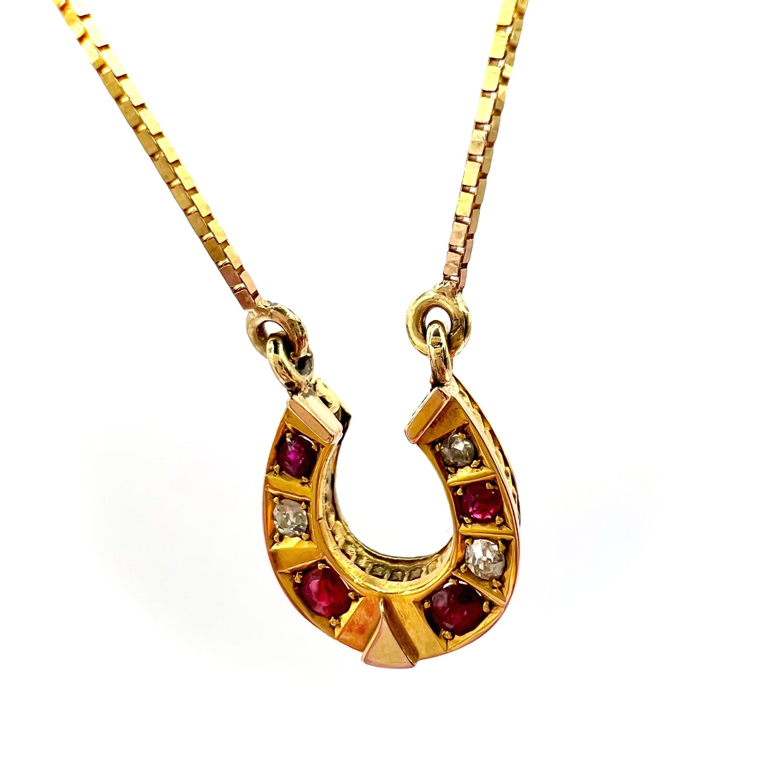 A beautiful early 20th century Victorian 9ct gold ruby and diamond horseshoe pendant, on a modern 42 cm 9ct gold box chain, in fine vintage condition, featuring a row of alternating graduated old European brilliant cut diamonds and rubies.