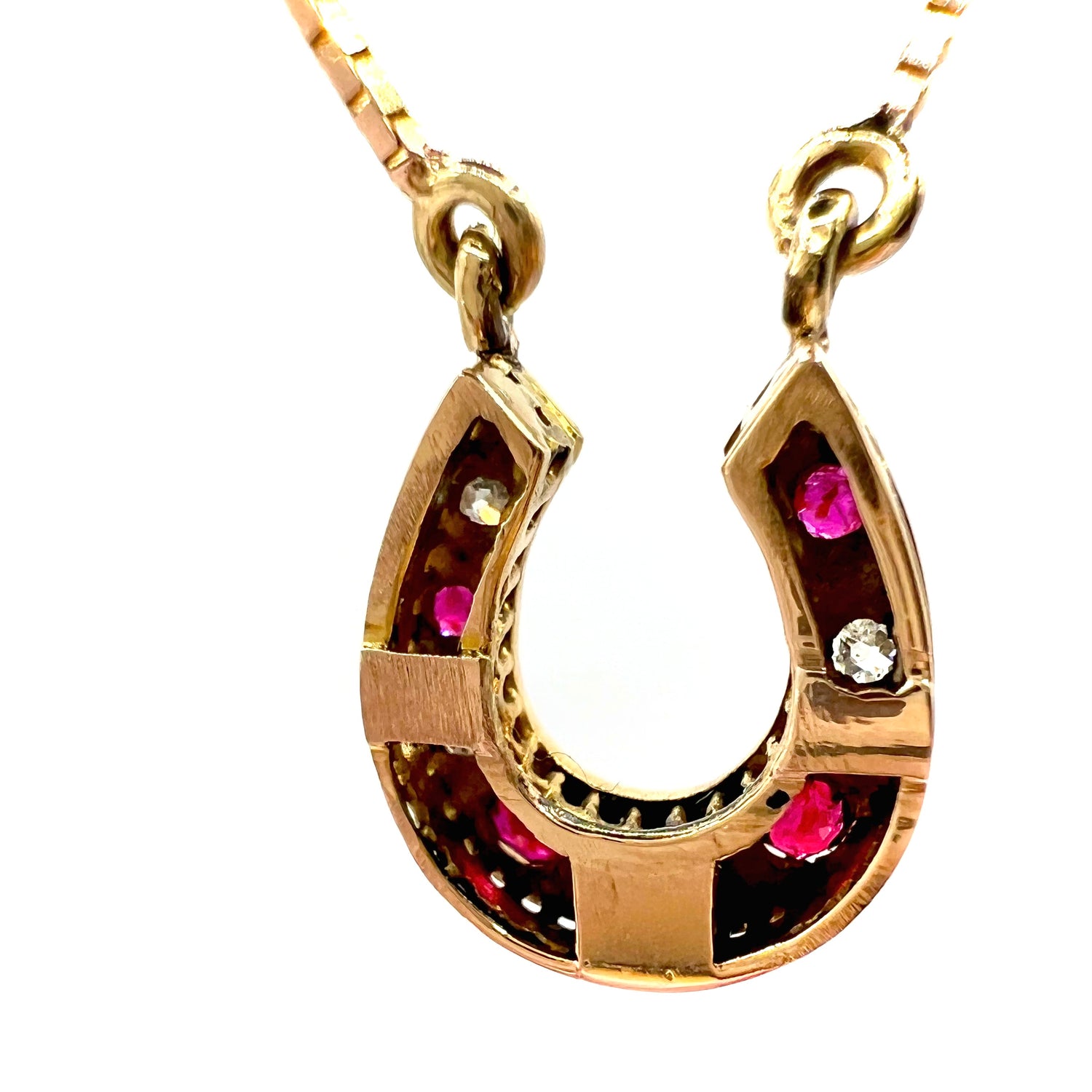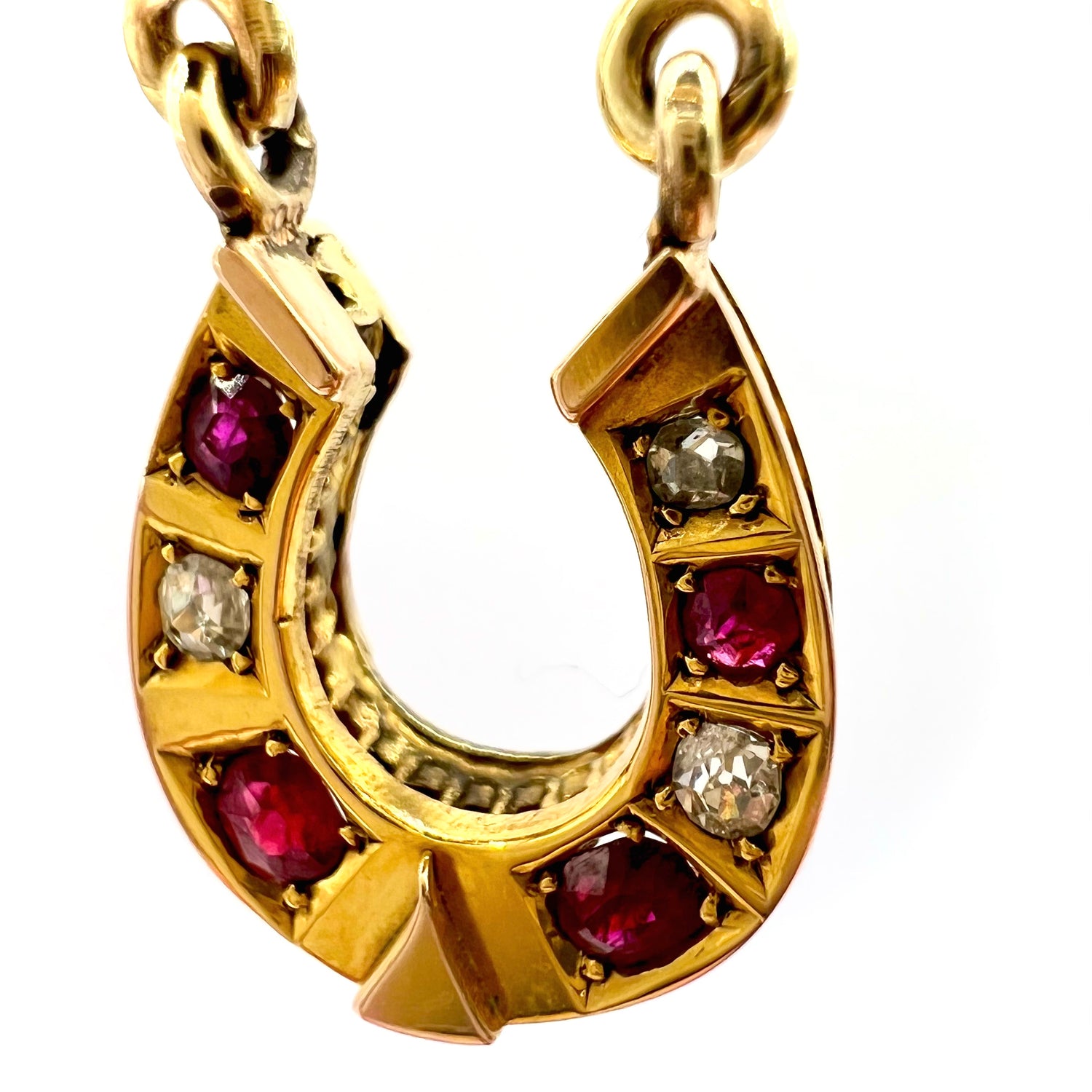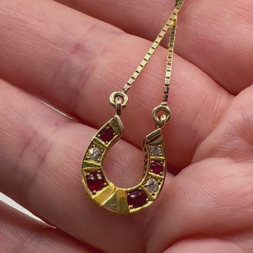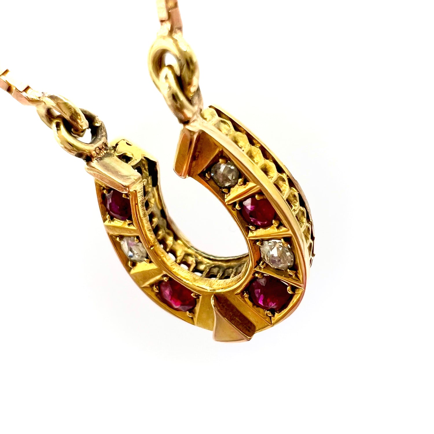 A beautiful early 20th century Victorian 9ct gold ruby and diamond horseshoe pendant, on a modern 42 cm 9ct gold box chain, in fine vintage condition, featuring a row of alternating graduated old European brilliant cut diamonds and rubies.