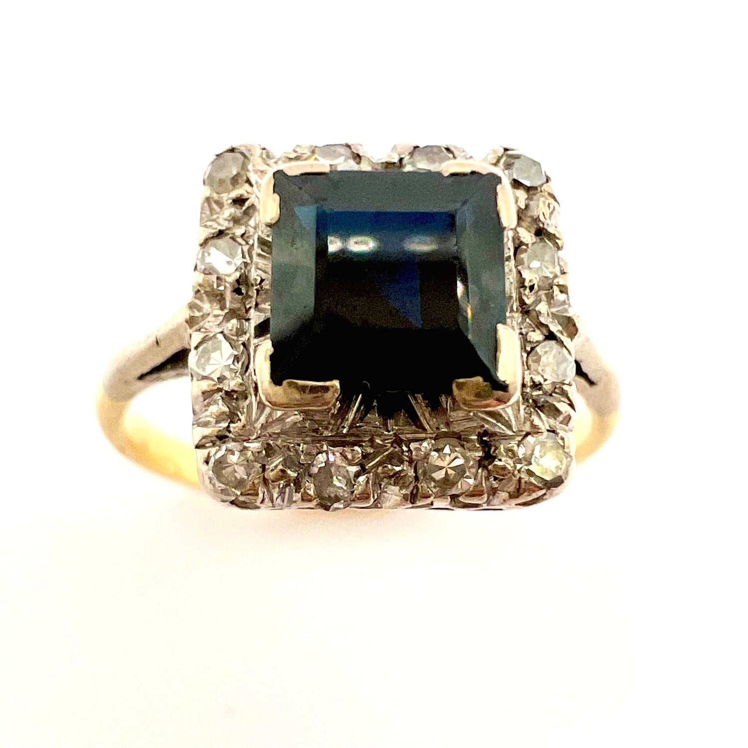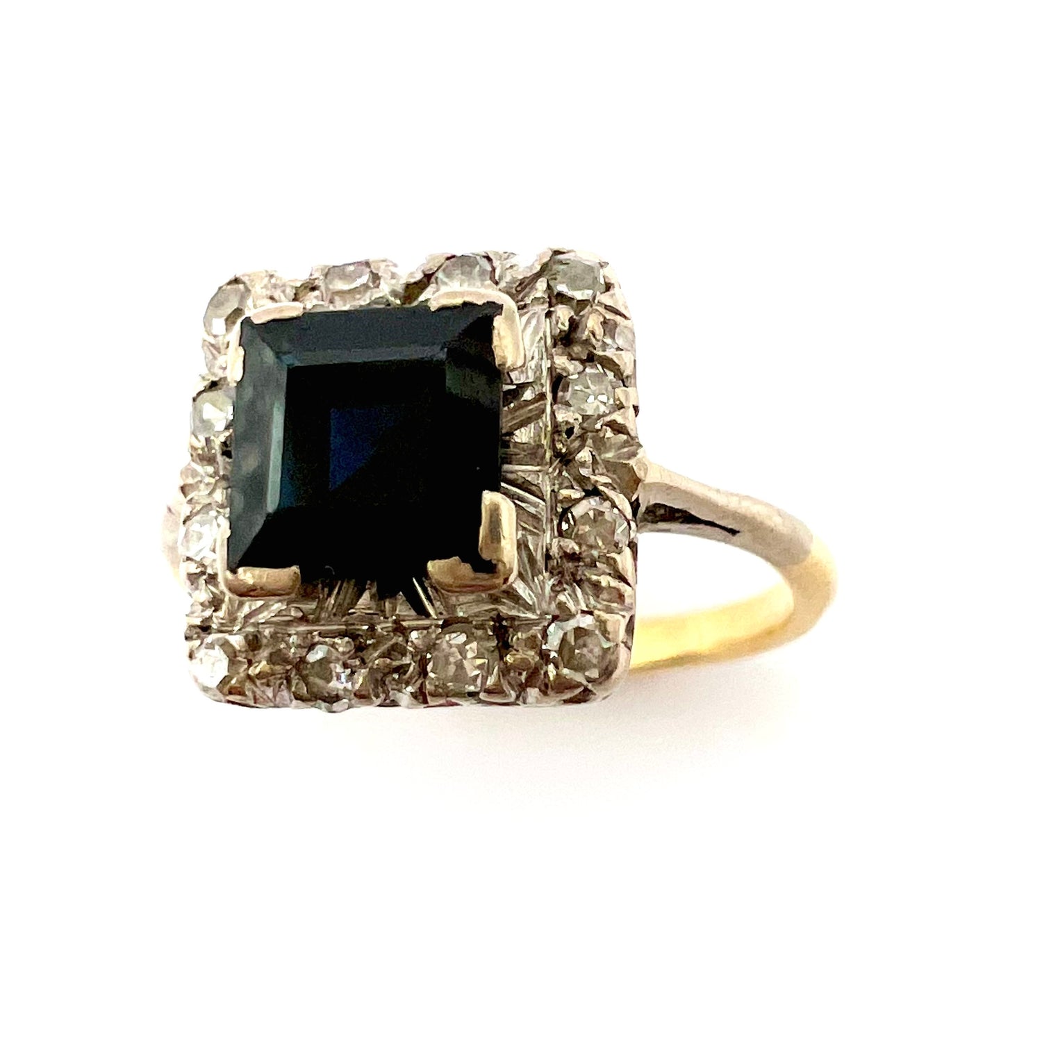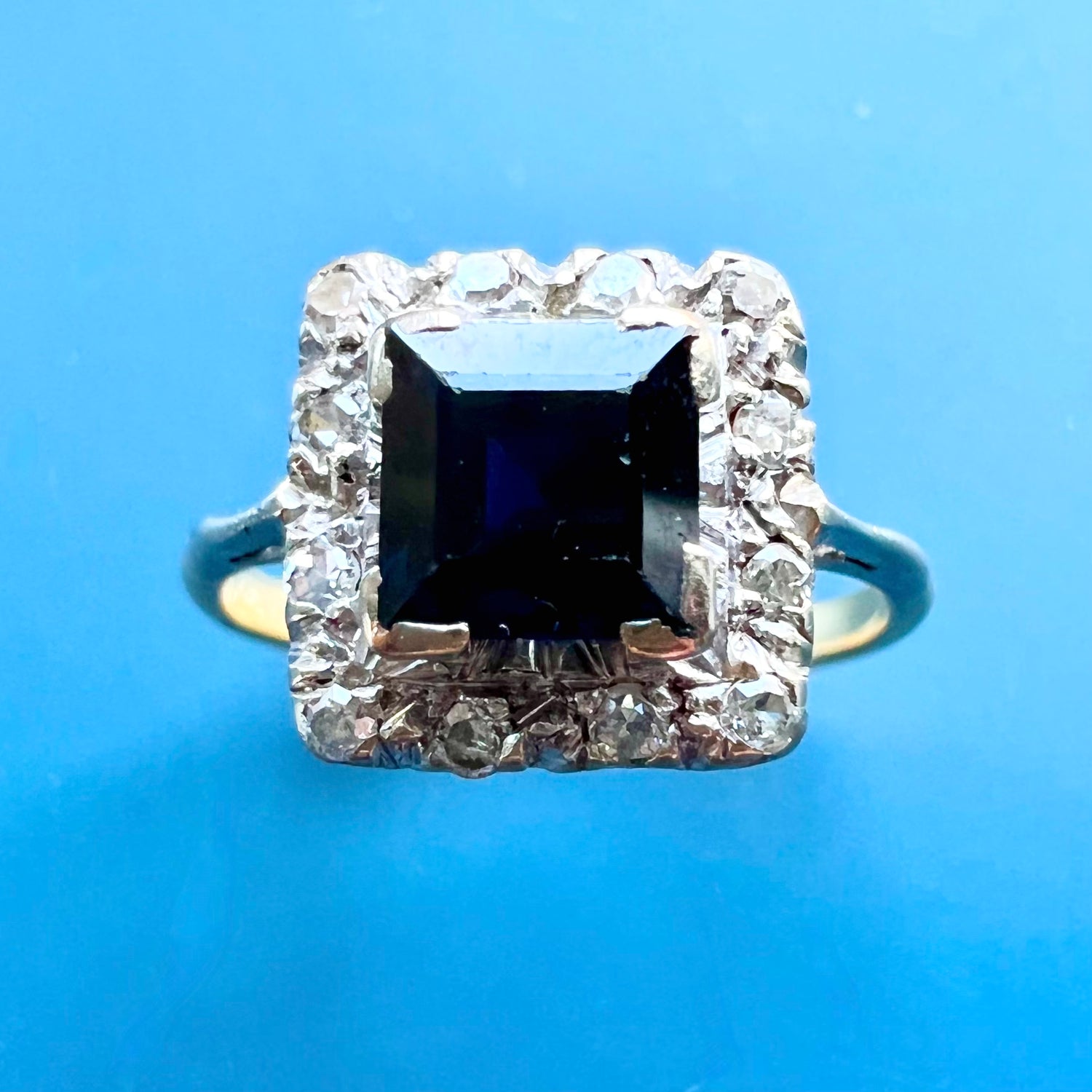 A sapphire and diamond platinum and 18ct gold dress cluster ring, set with a central dark blue square, step cut sapphire, surrounded by eight cut diamonds, with tapered shoulders.