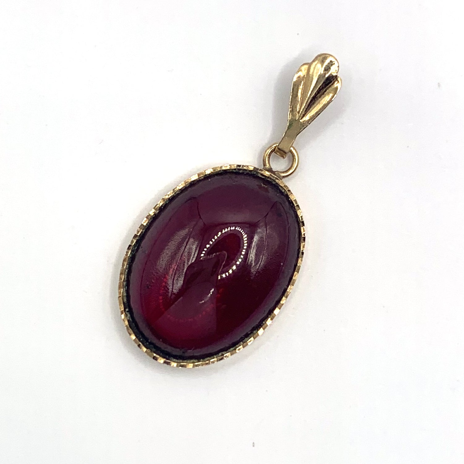 A very pretty, delicate vintage 9ct yellow gold and garnet pendant in fine vintage condition, featuring a cabochon gem in a scalloped gold setting, and full British hallmarks.