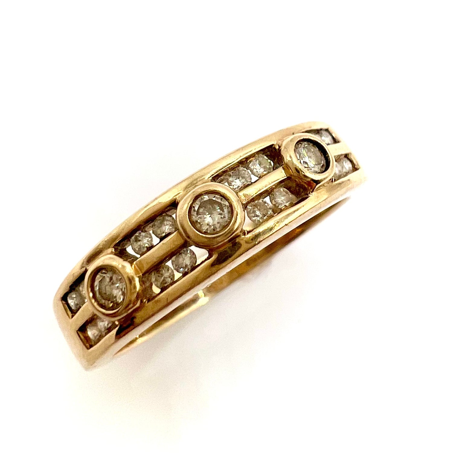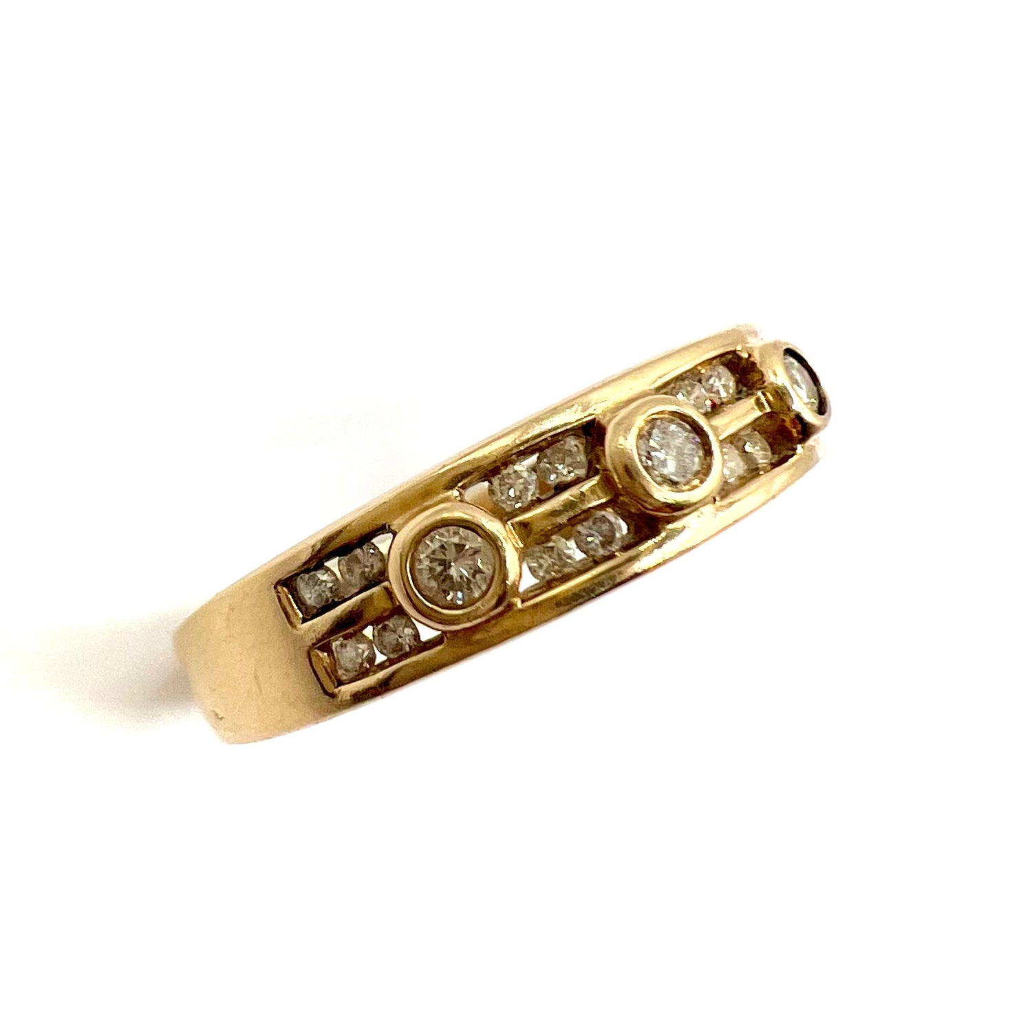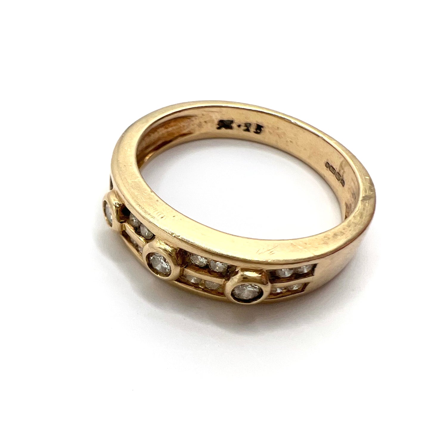 A solid 9ct gold diamond fronted dress band, in fine vintage condition, featuring set 3 raised brilliant cut diamonds, as well as 16 small channel set diamonds in an Art Deco style setting.