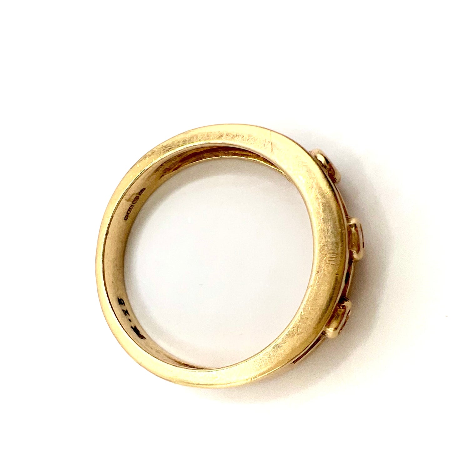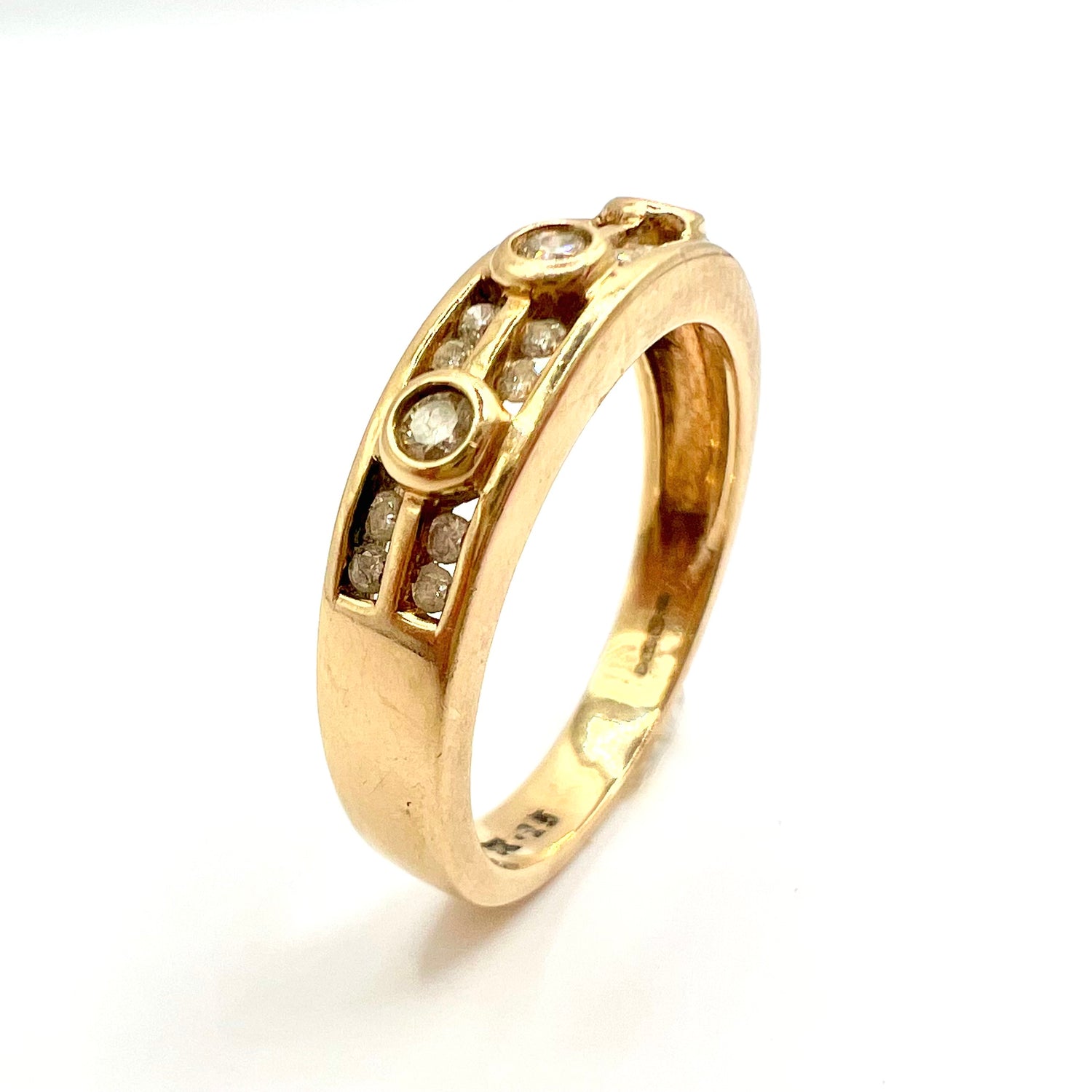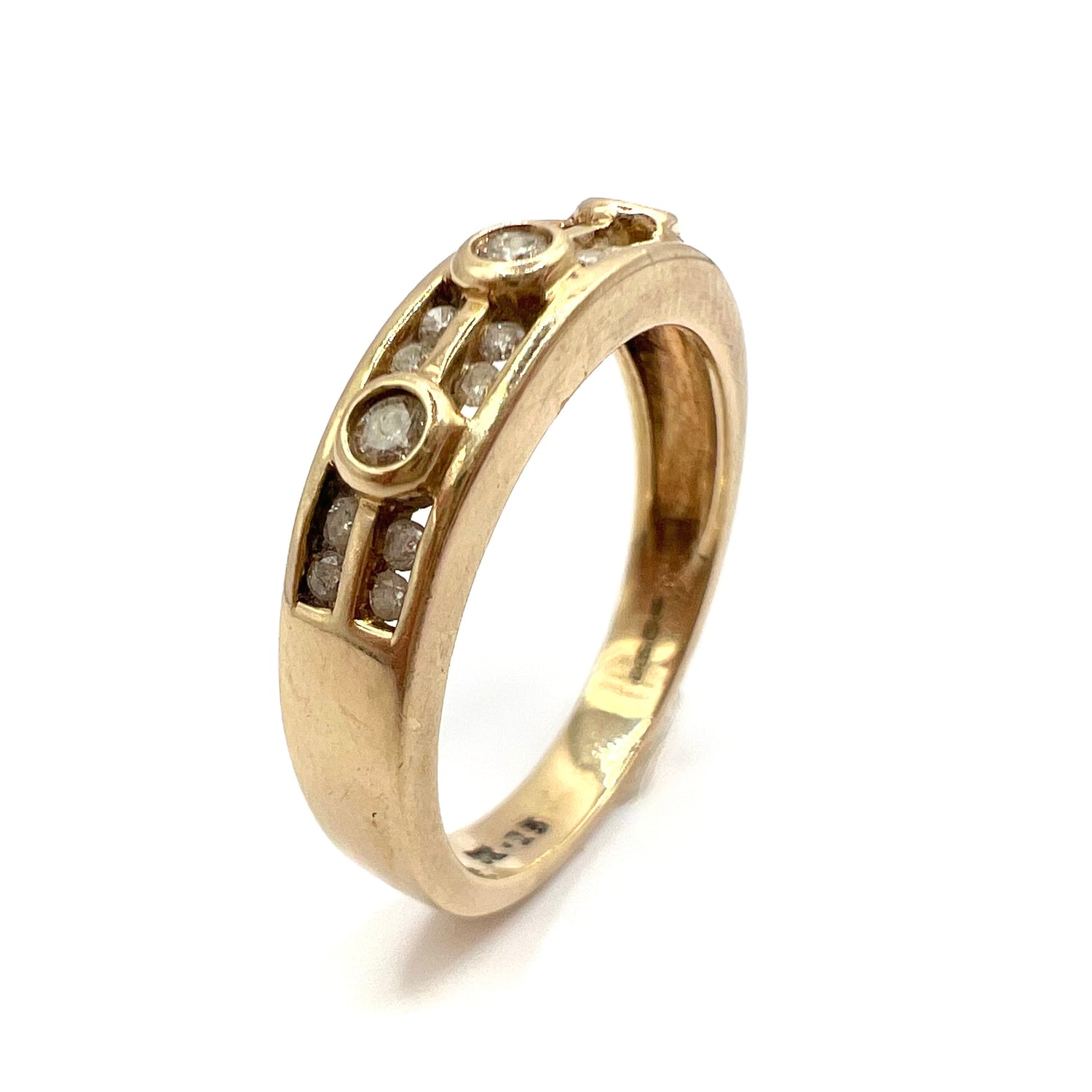 A solid 9ct gold diamond fronted dress band, in fine vintage condition, featuring set 3 raised brilliant cut diamonds, as well as 16 small channel set diamonds in an Art Deco style setting.