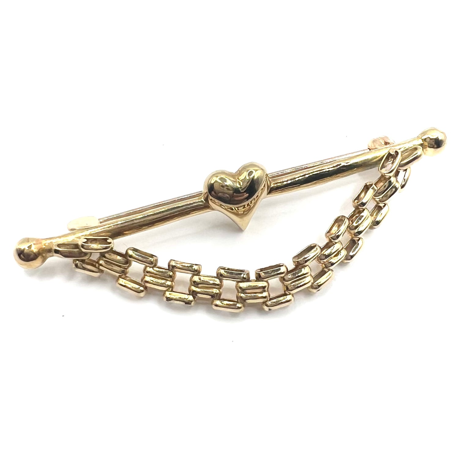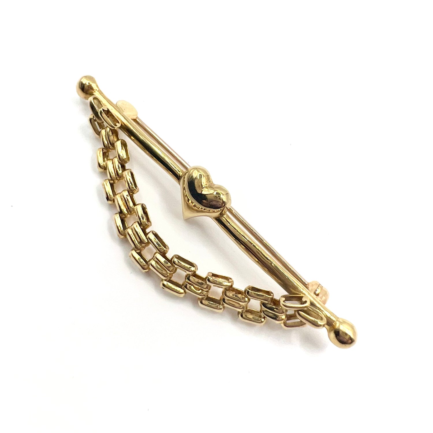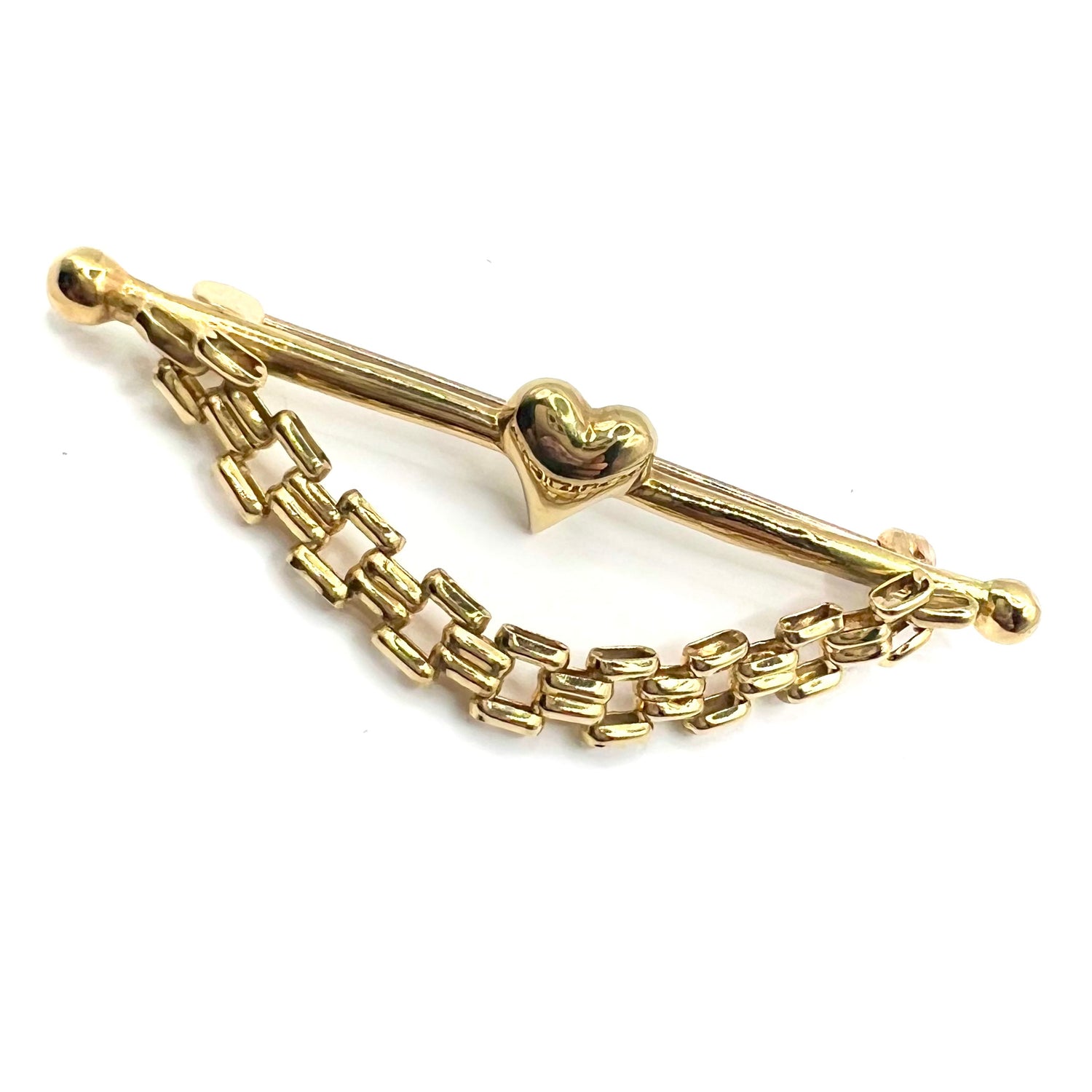 A beautiful 9 ct gold t-bar pin in fine vintage condition, featuring a central heart and suspending a linked chain. A charming late 20th century piece that would look great on a black sweater or white shirt.