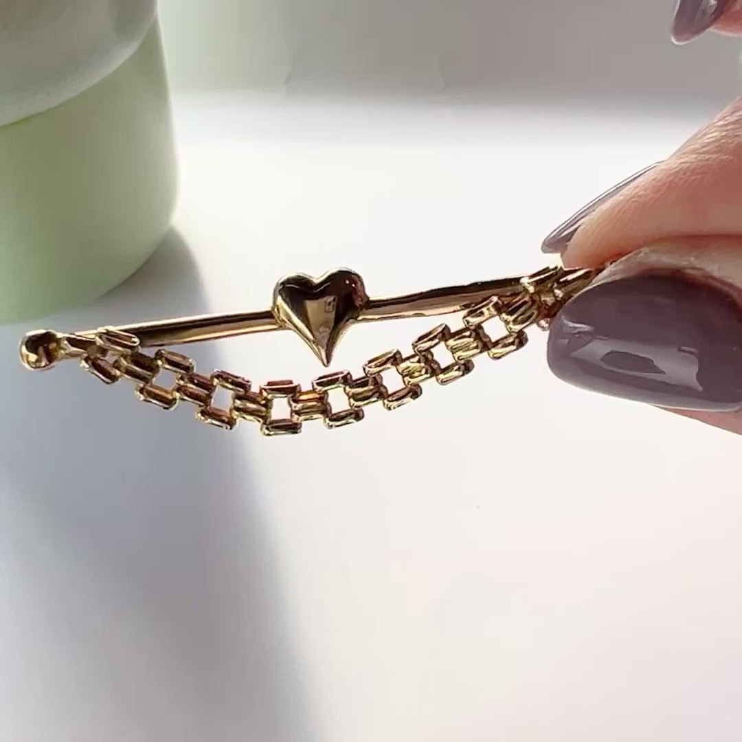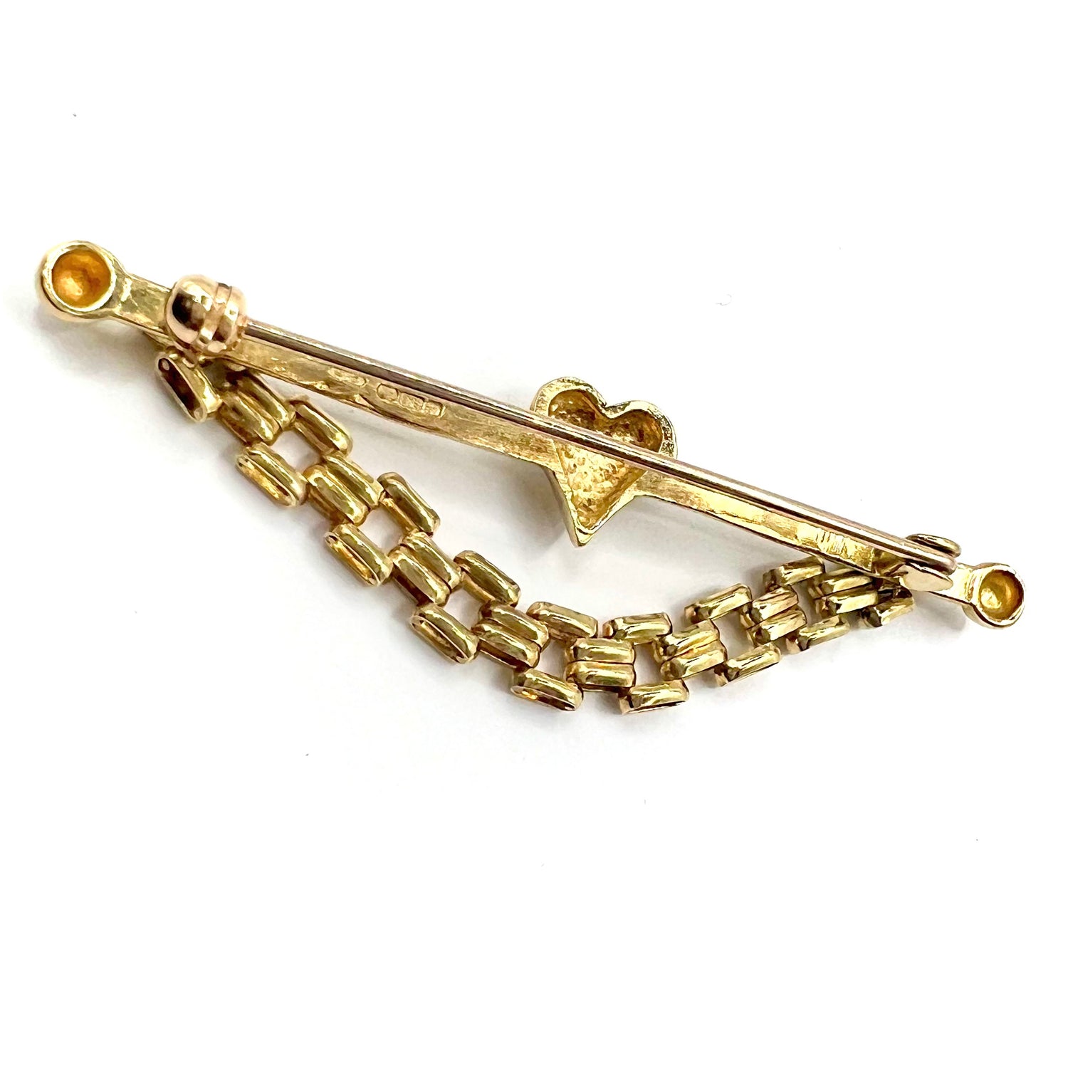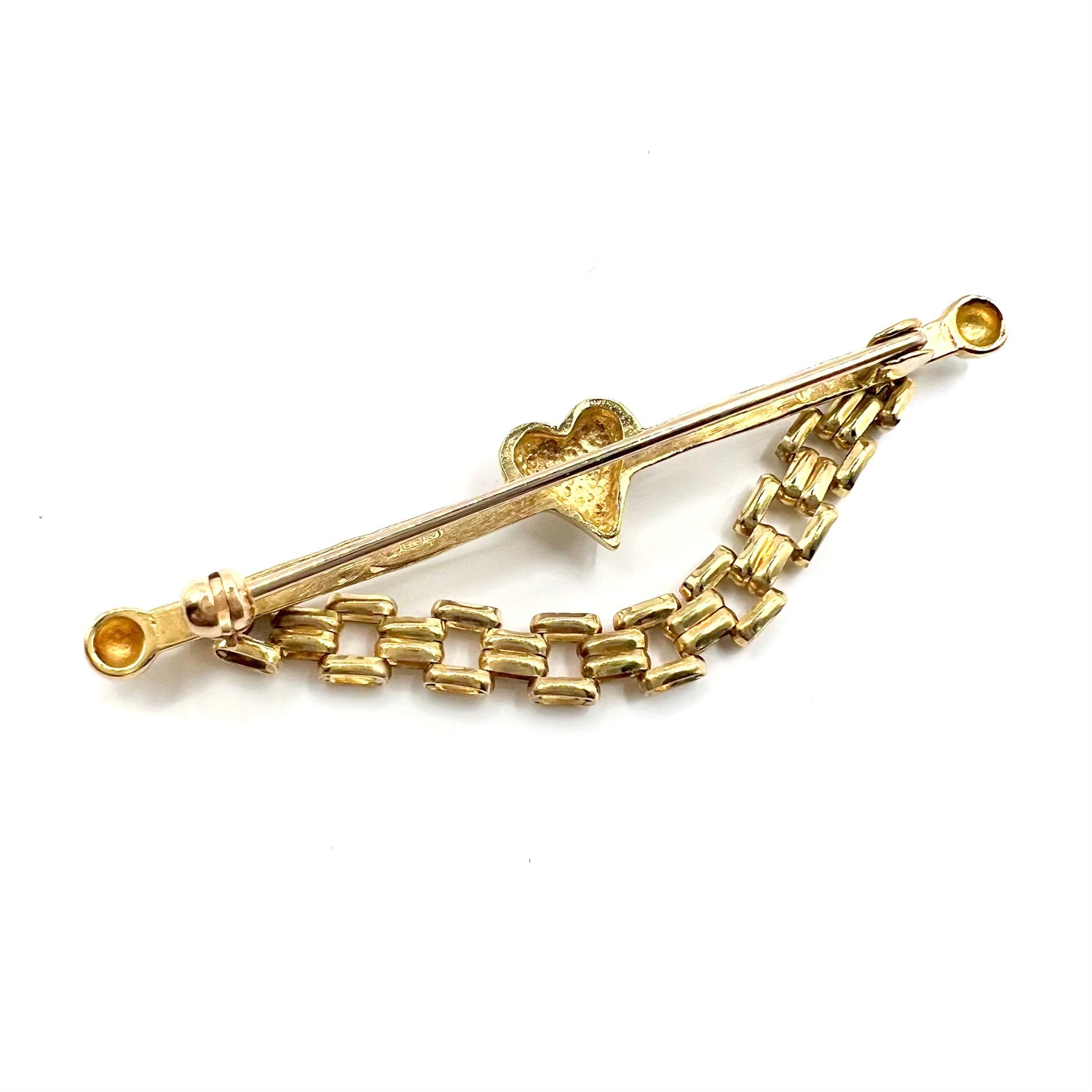 A beautiful 9 ct gold t-bar pin in fine vintage condition, featuring a central heart and suspending a linked chain. A charming late 20th century piece that would look great on a black sweater or white shirt.